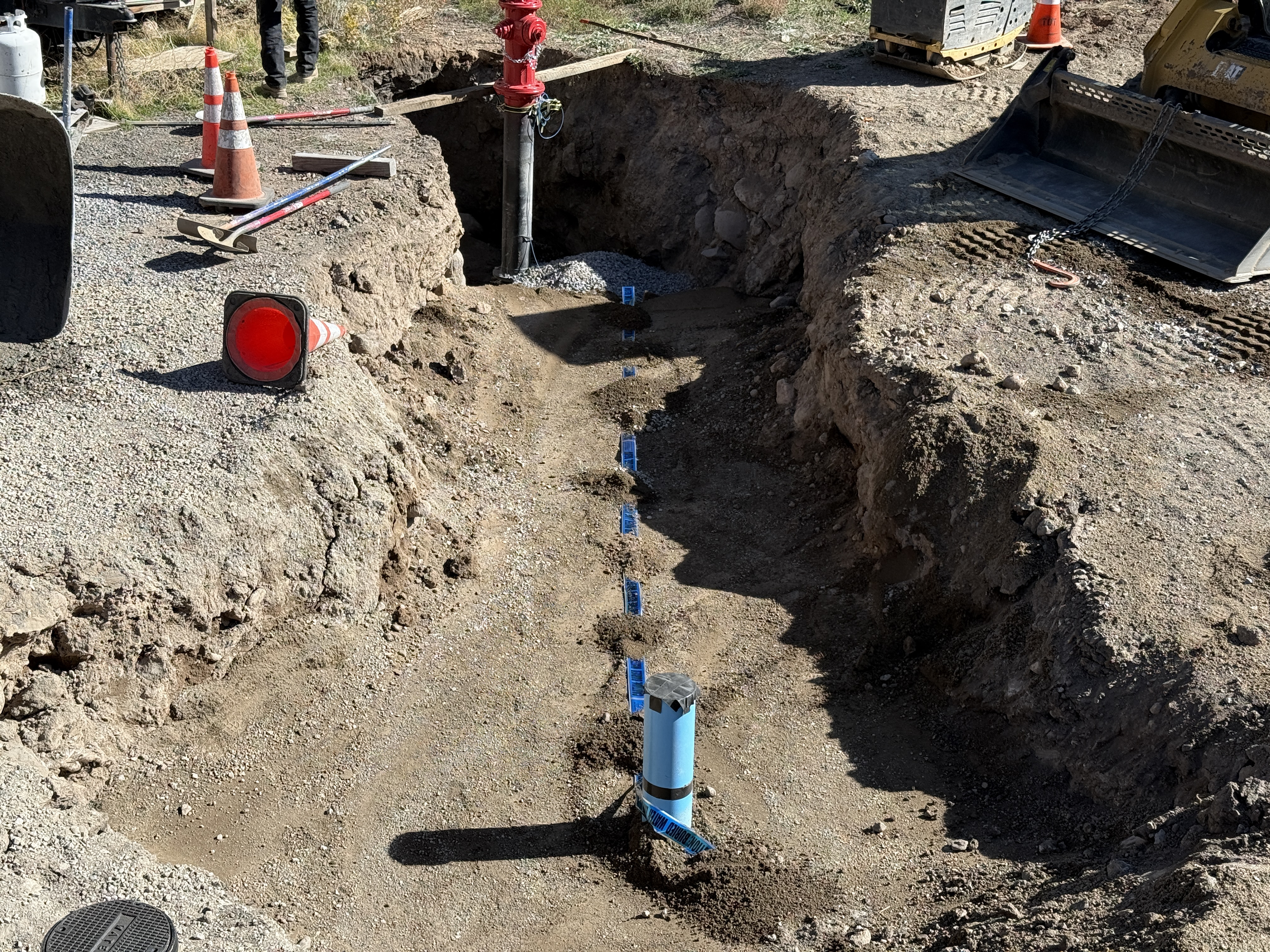 The image shows an excavation area with a focus on trenching activity. A series of blue pipe segments are installed in the trench leading to a newly placed red fire hydrant. Several construction cones are placed around the site, and a backhoe loader is positioned nearby. The surface appears to be gravel and soil, and construction tools are placed along the edge of the trench.