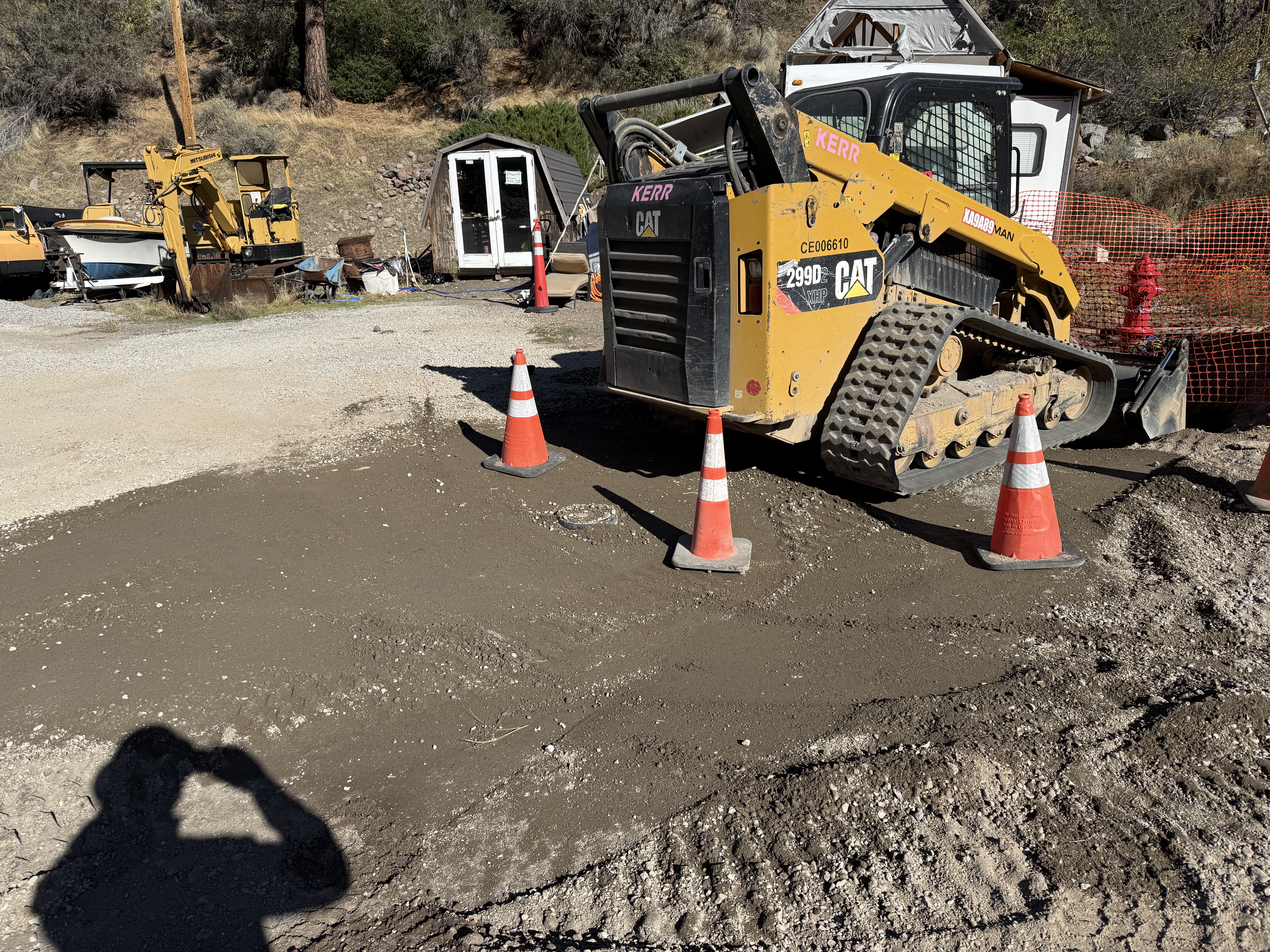 A skid-steer loader is positioned near a fire hydrant, surrounded by several orange traffic cones. The ground surface appears to be dirt or soil, possibly prepared for construction work. A shed and other equipment are visible in the background. The presence of the skid-steer indicates site preparation or excavation activities might be underway, but this is not confirmed.