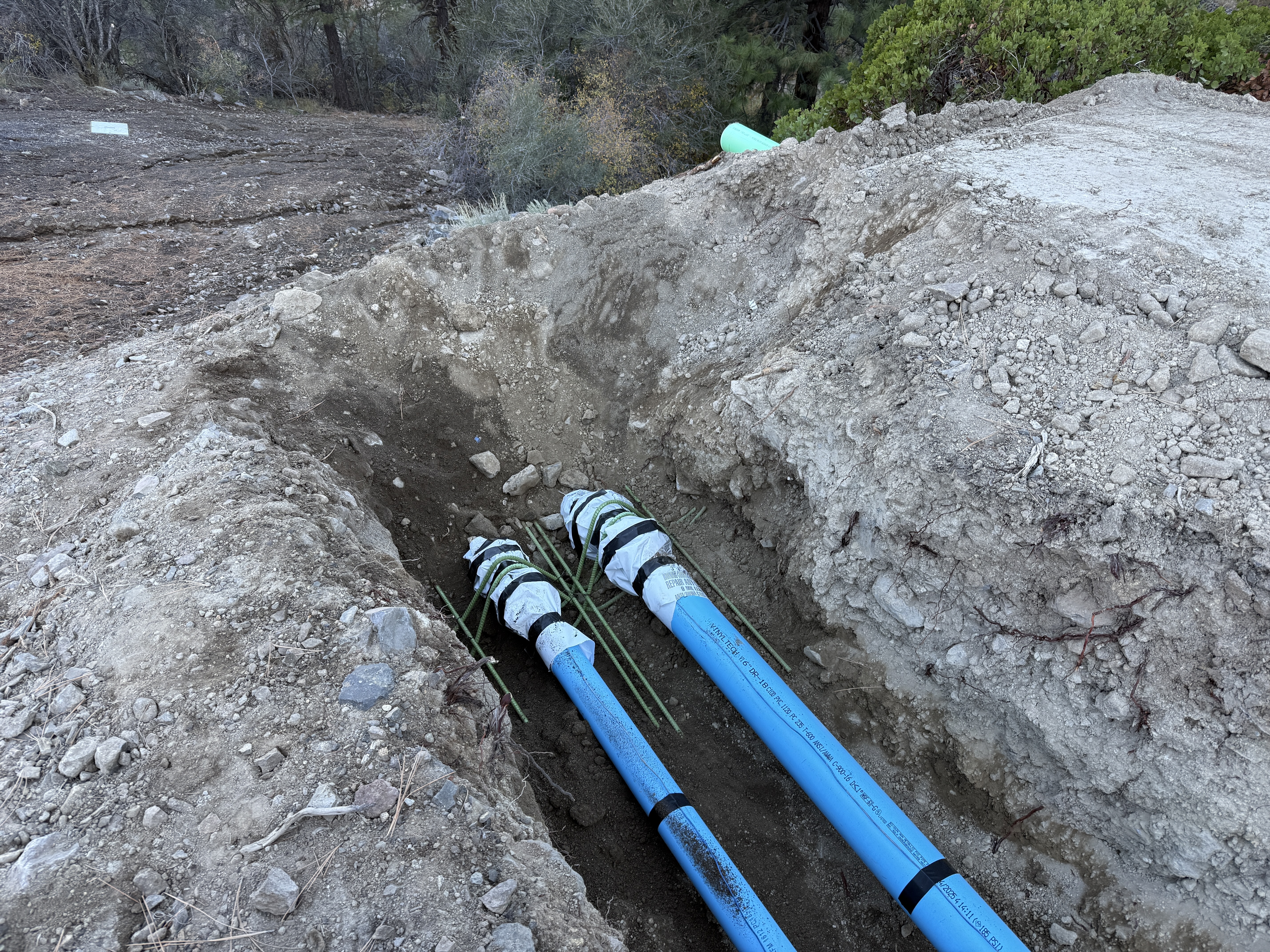 The image shows an open trench with two blue pipes that are partially buried. The pipes appear to have protective insulation and are held apart by green spacers. The surrounding area is rough excavated soil with a mix of rocks and dirt. There are no visible workers or specific safety controls present in the frame.