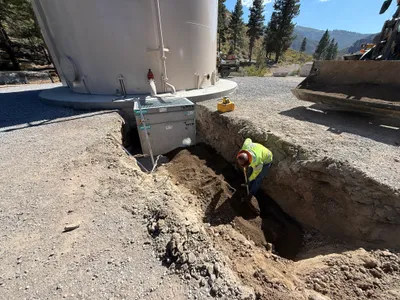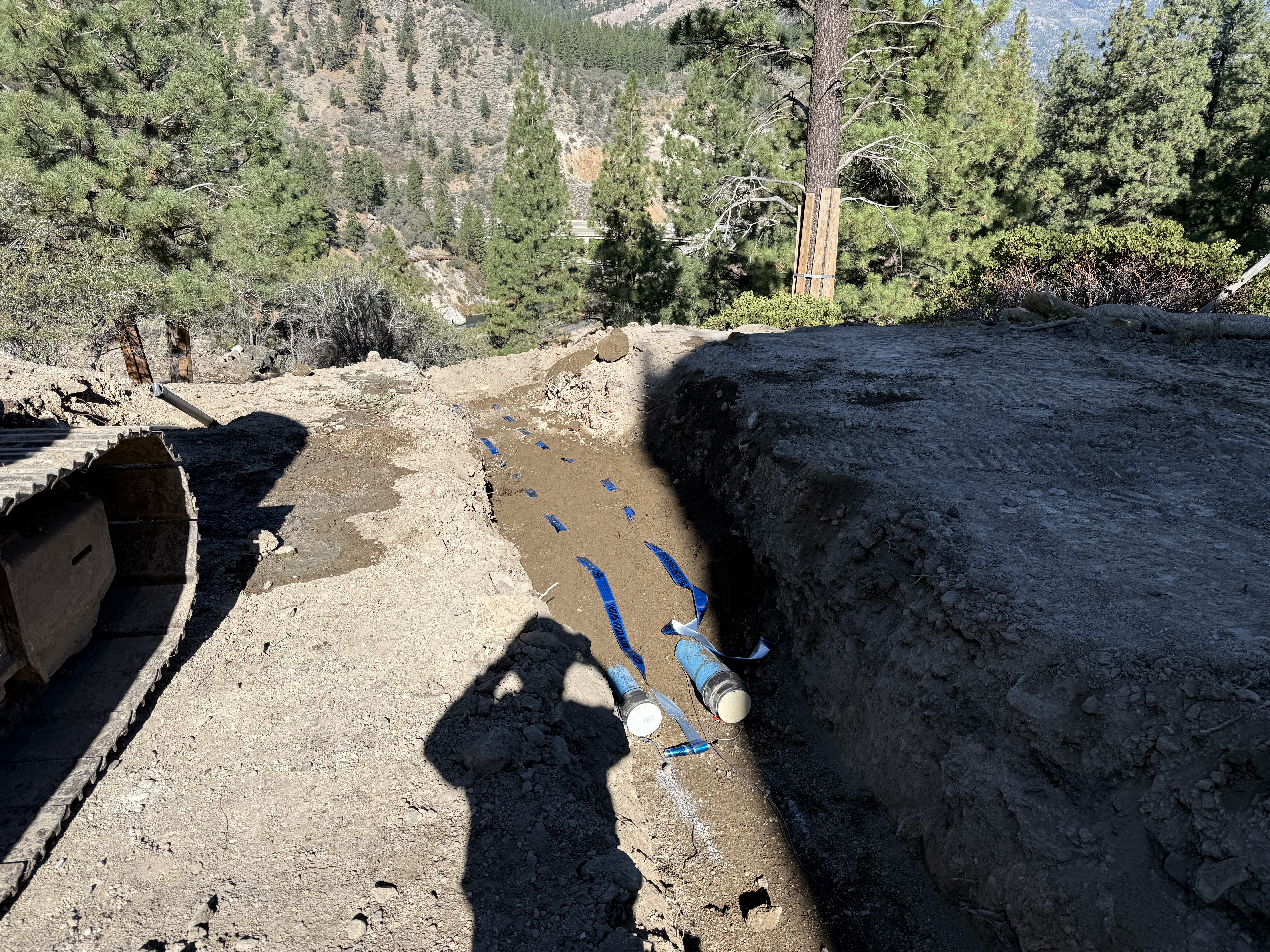 The image shows a trench at a construction site with a pipeline partially exposed. Blue tape and pipes are visible within the trench, while a portion of heavy machinery is visible on the left side. The area is surrounded by trees and the trench runs parallel to a dirt path. There is a shadow visible, presumably from the person taking the photo.