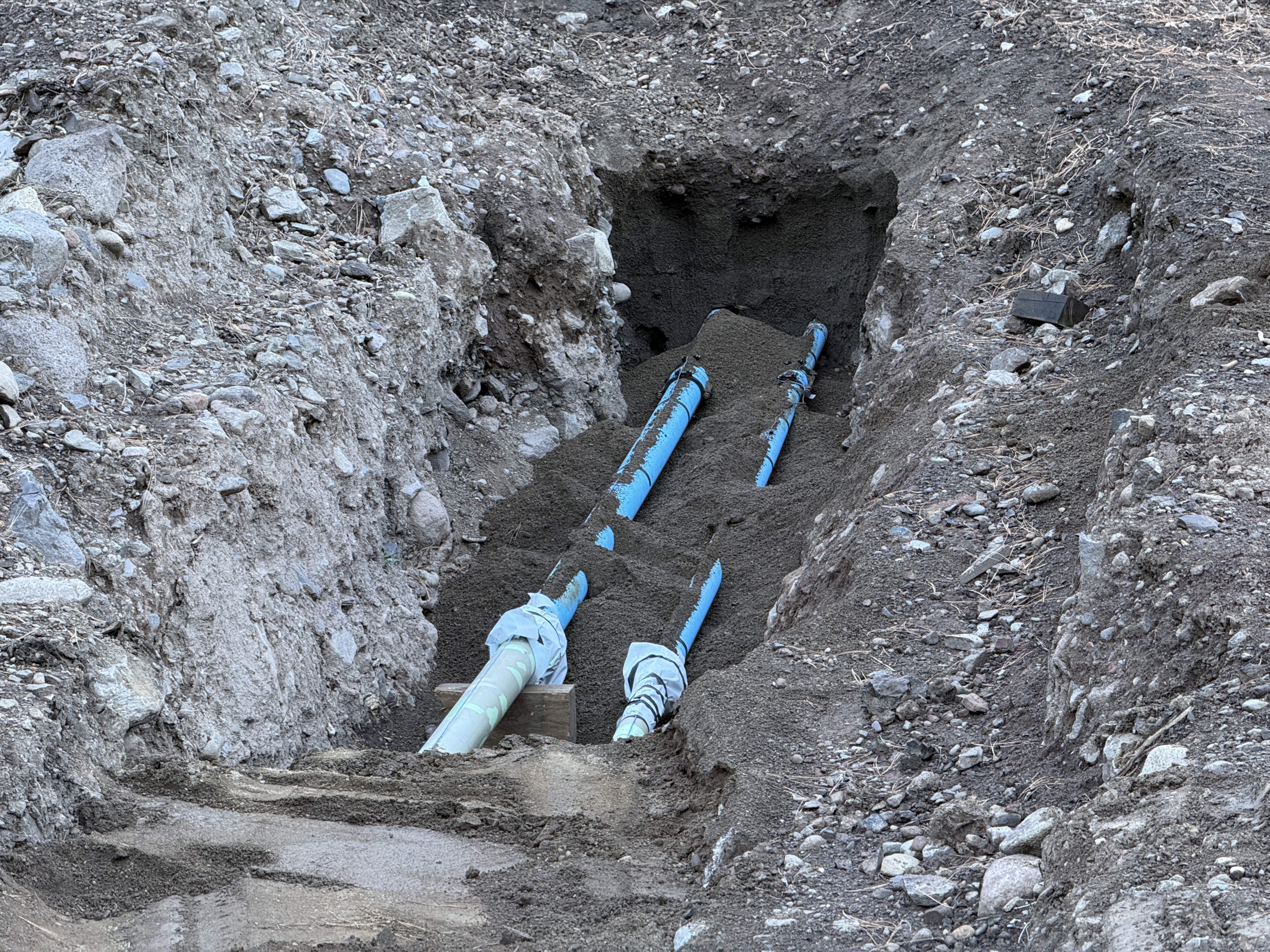 The image shows an open trench with multiple blue and green pipes placed within. The trench is filled partially with soil, indicating ongoing or recently completed installation activities. The slope and sides of the trench reveal a rocky soil condition. There are no visible workers or equipment directly in the frame.