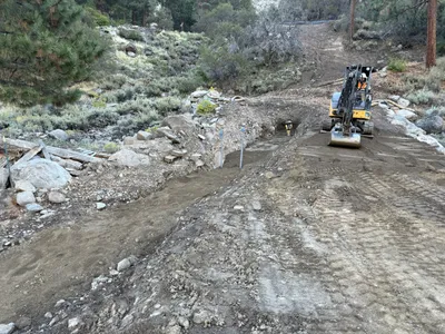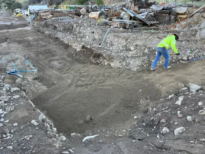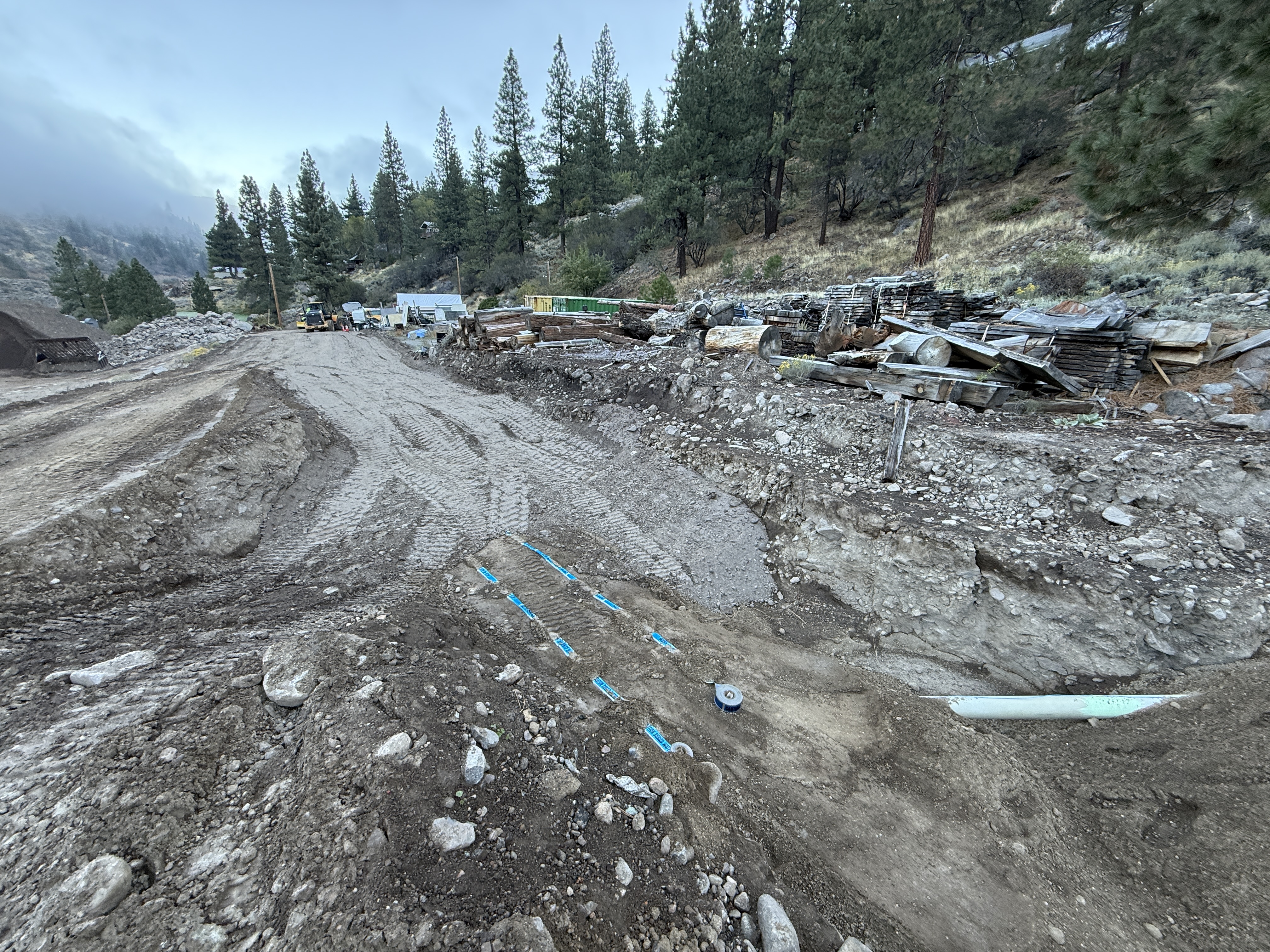 The image shows a clear trench area with exposed soil and some partially buried pipes, indicating pipeline installation or preparation for installation. Stacks of materials are visible on the right, along with trees and vegetation in the background. There is heavy machinery visible, suggesting ongoing construction work, but specific activities are not confirmed.