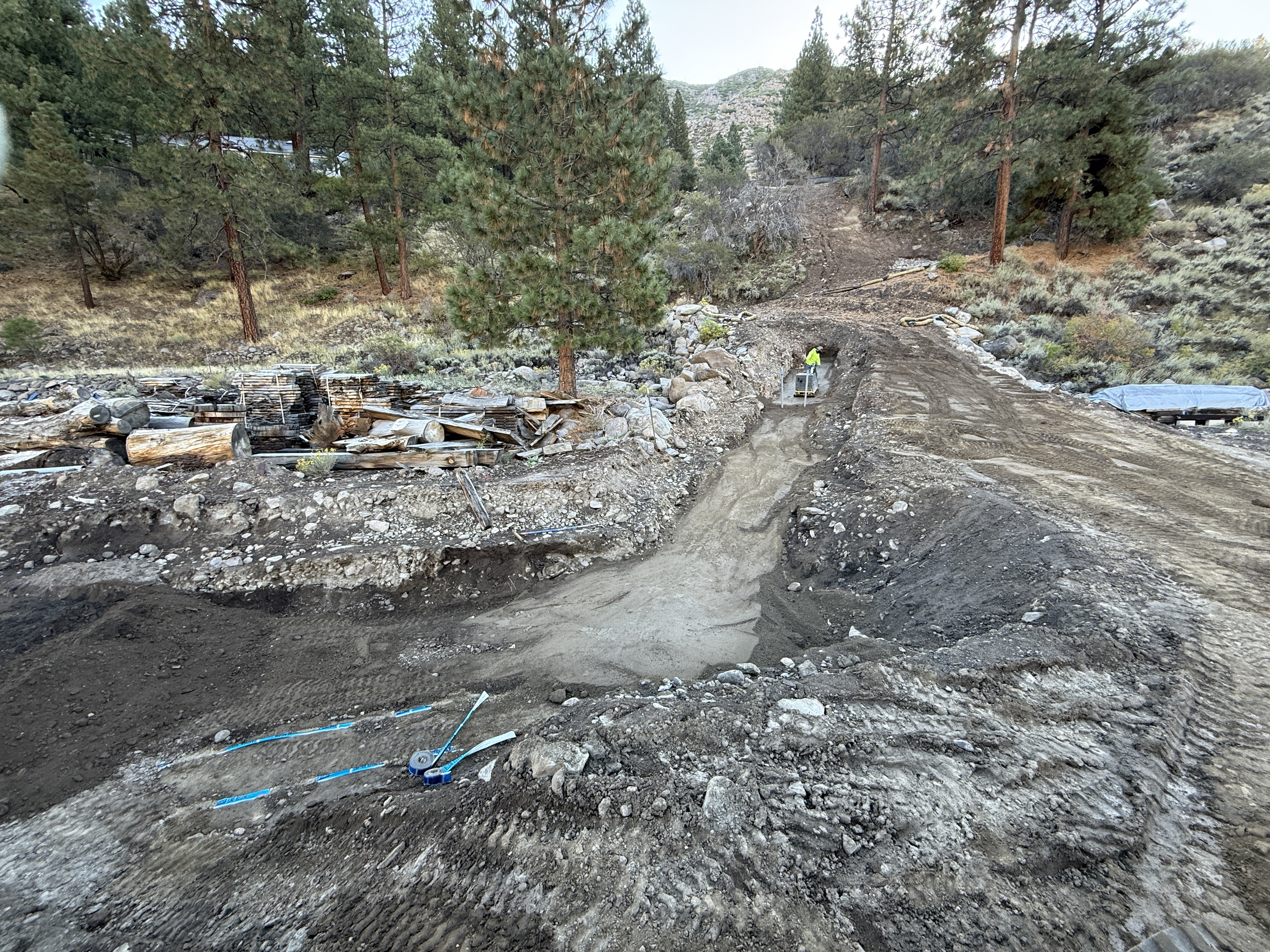 The image shows a trench running through a wooded area with loose soil and rock excavation. A worker is visible at the far end of the trench. Piles of logs and other materials are staged on the left, and a covered object is on the right. This appears to be part of a trenching project potentially for pipeline installation.