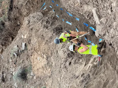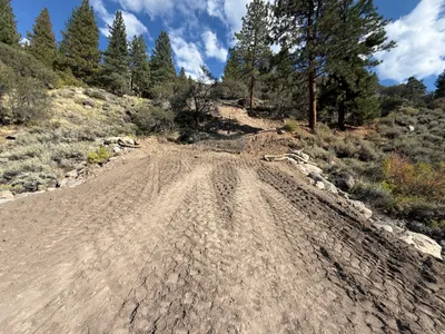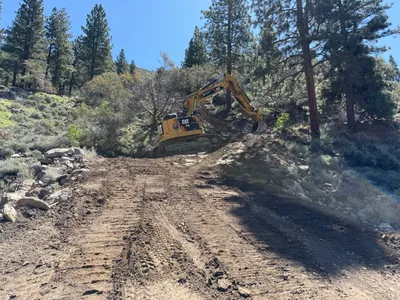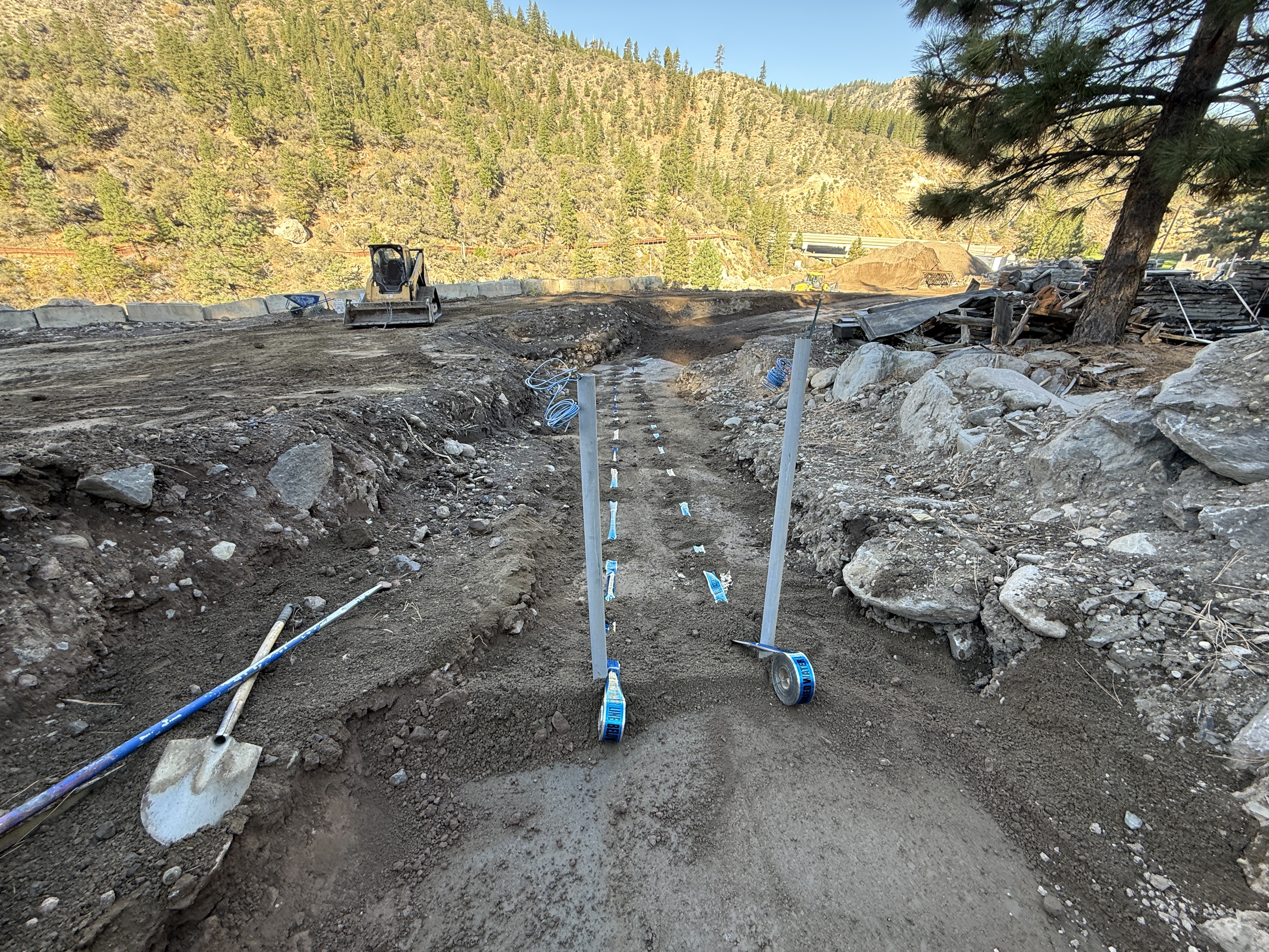 This image shows a trenching operation with layout measurements in progress. Two measuring wheels and a shovel are prominent in the foreground, indicating ongoing layout or measurement work. A bulldozer is positioned in the background on the cleared site. The terrain is uneven with visible dirt and rocks, and there are no workers in the frame. The surrounding area is wooded, providing a natural backdrop.