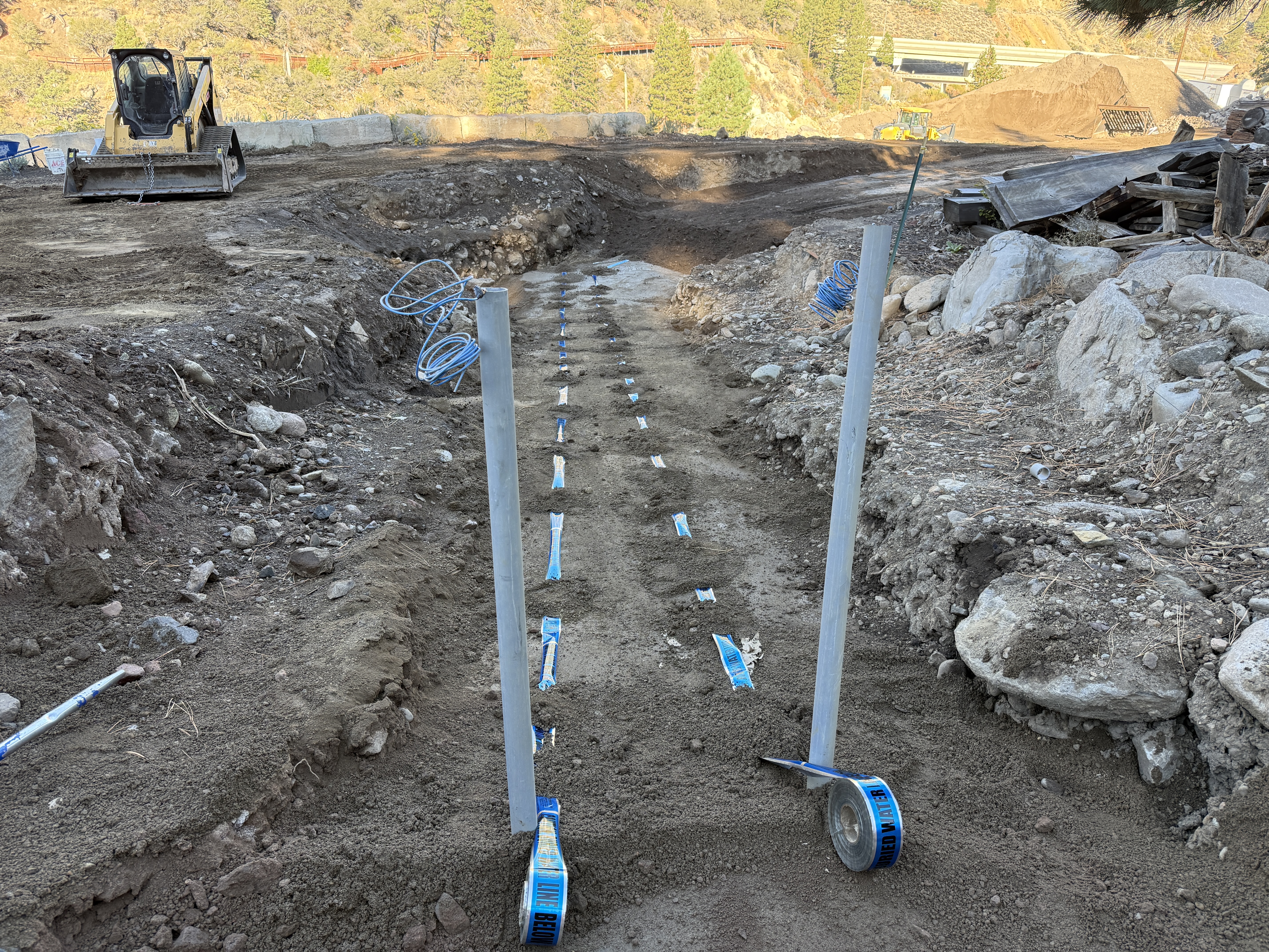The image shows a trench with blue marking tape laid along its bottom, indicating preparation for possible utility installation. Some metal posts are positioned vertically at the trench entry. A piece of heavy equipment is visible in the background, suggesting ongoing excavation or earthmoving activity. The surrounding area is rough with soil and rocks, indicating an active construction environment.