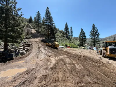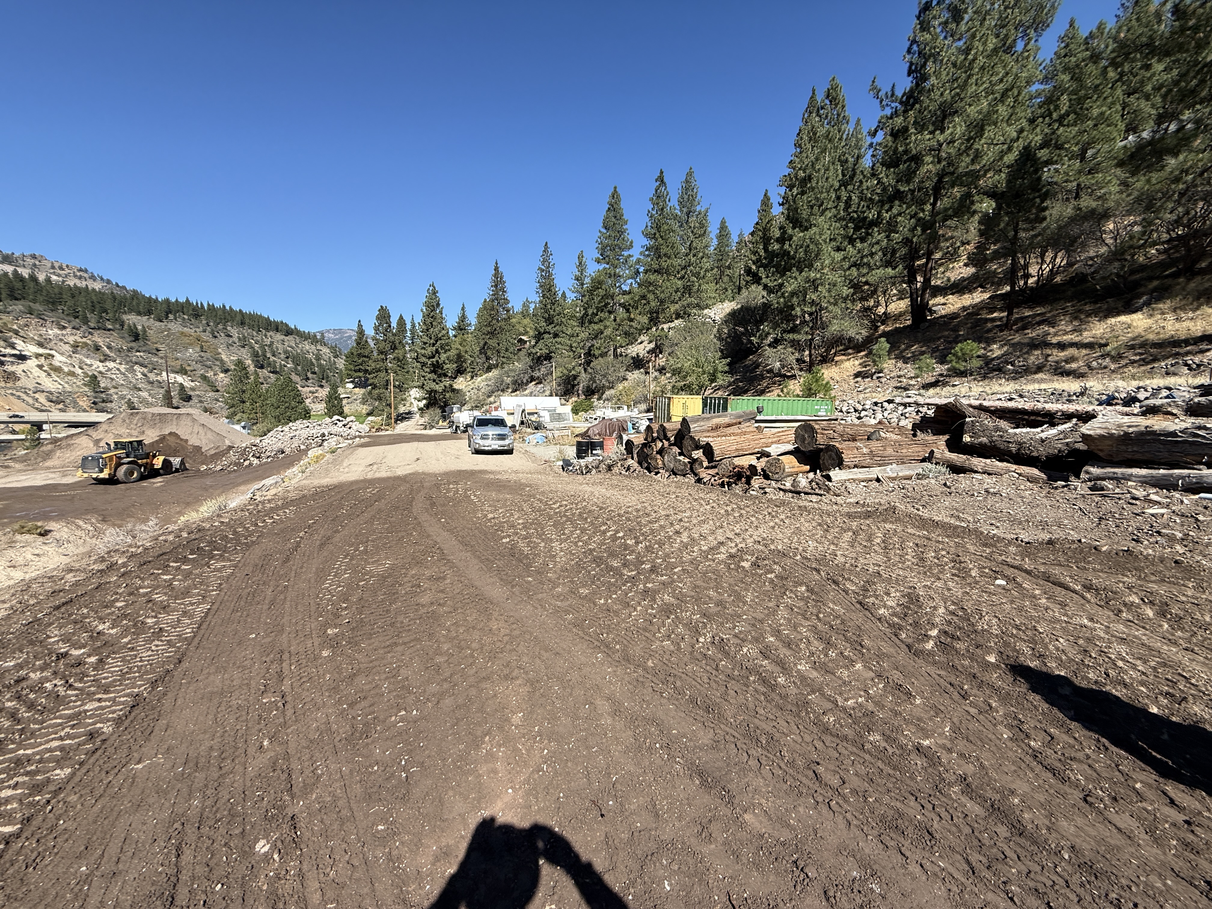The image shows a site grading operation with a bulldozer moving soil on the left side. Logs are stacked on the right, and a white truck is parked in front of a row of shipping containers. The area is surrounded by trees and hills under a clear sky.