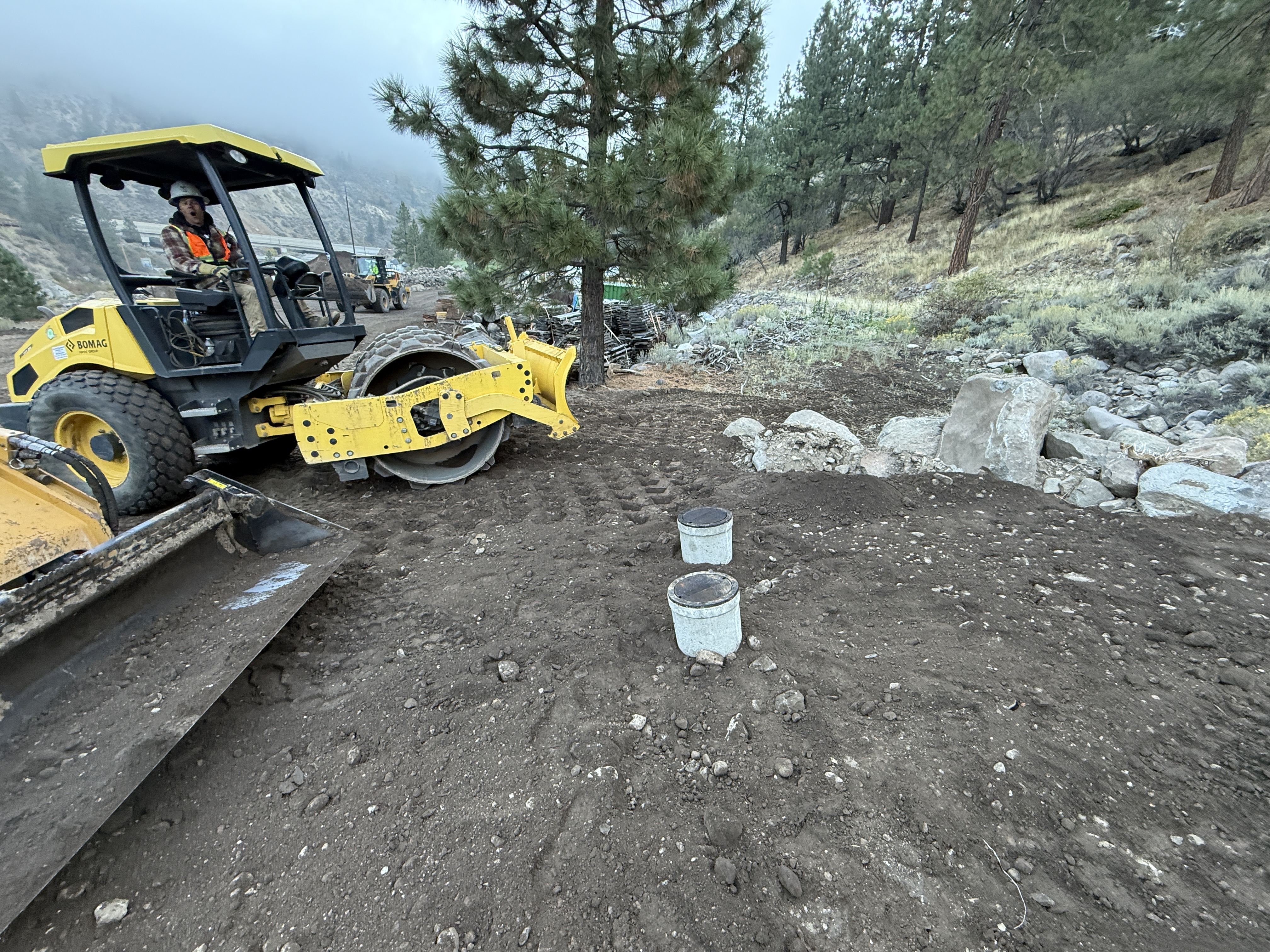 The image shows a compactor operating on a soil area, likely compacting the ground. A construction worker is present, wearing a hard hat, hi-vis vest, and work boots, indicating safety compliance. In the foreground, there are two cylindrical concrete structures partially buried in the soil. The environment is a graded area with trees and rocky terrain in the background.