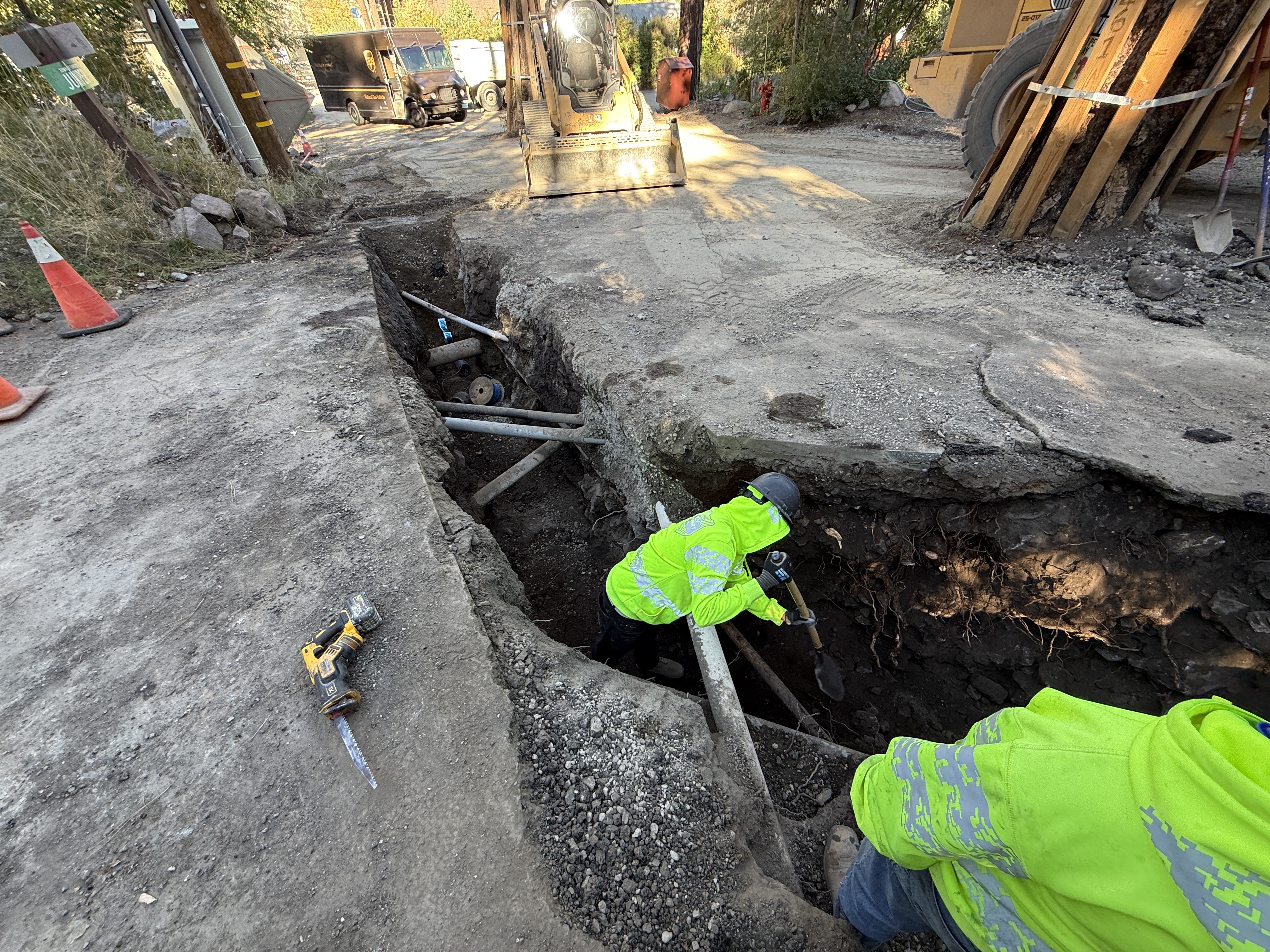 open trench with soil and rough pavement daylight conditions congested with equipment and close vehicle access