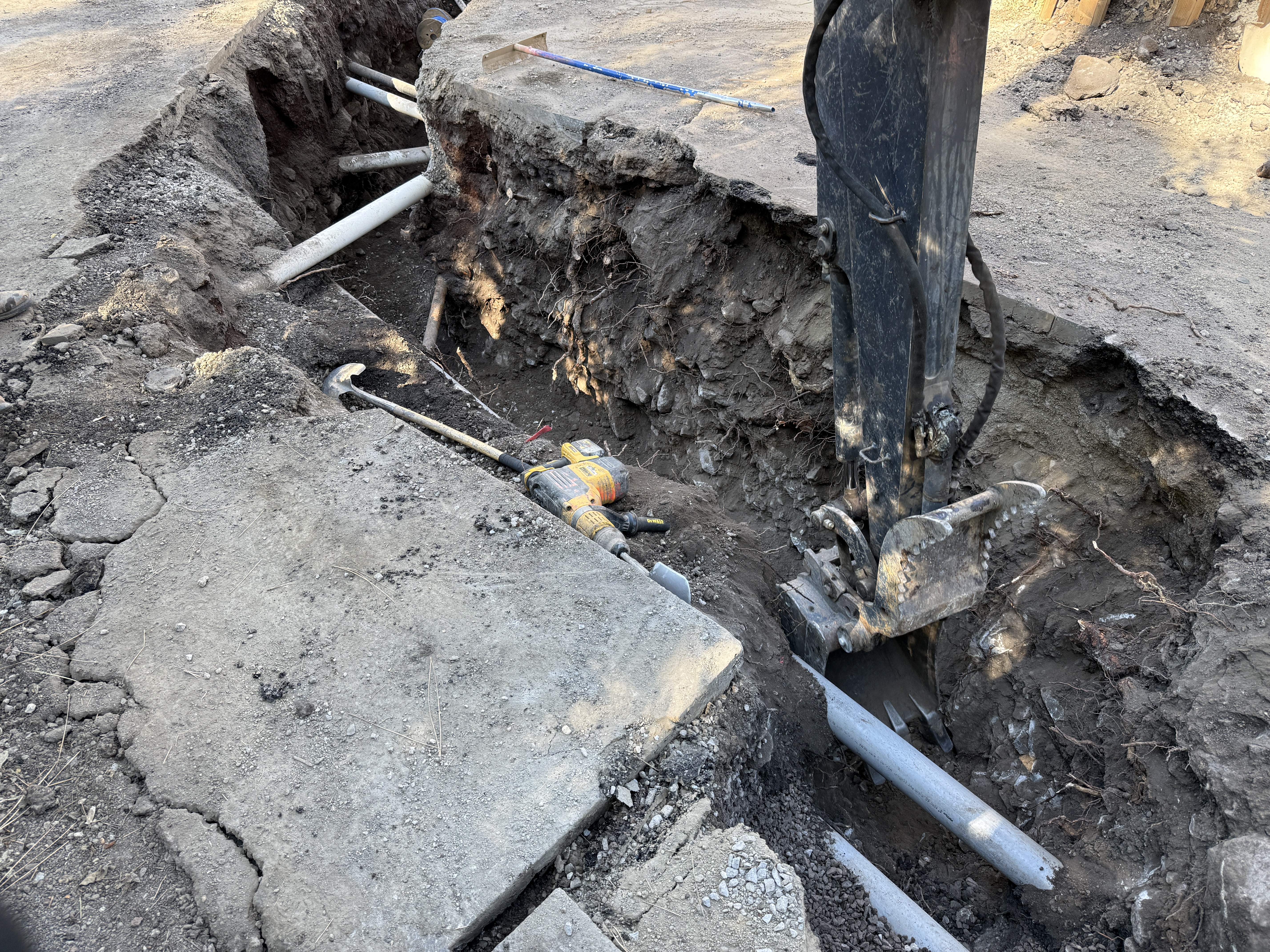A trench has been excavated with visible pipes laid within it. An excavator arm is actively digging or positioned at one end of the trench. Construction tools like a power drill are visible on the edge of the trench. The surrounding area shows uneven ground and exposed soil.