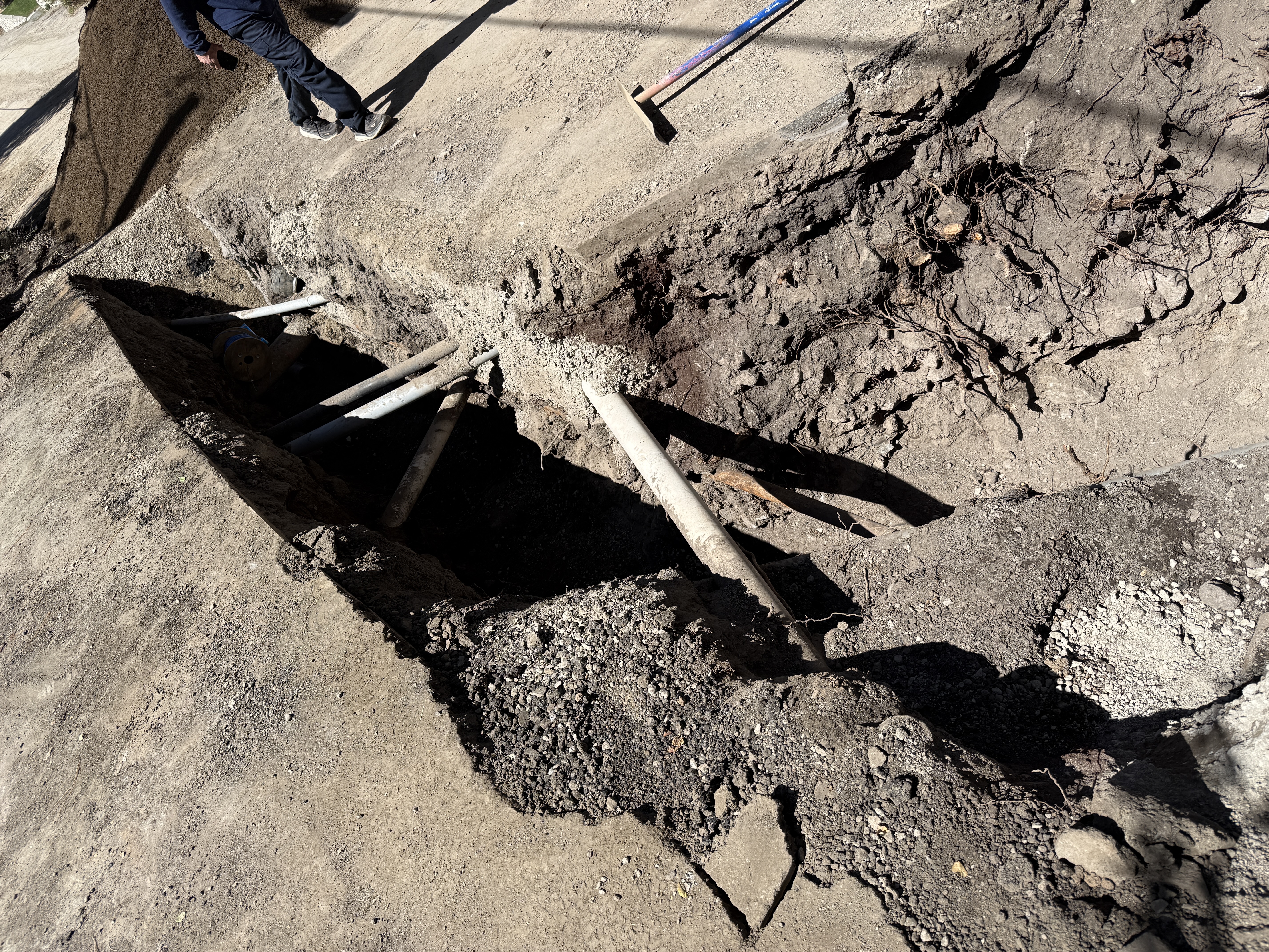 broken concrete and soil bright sunlight visible person standing at trench edge