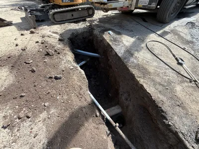 The image shows an excavated area with visible disruption to a concrete surface and exposed soil. Several pipes are protruding and exposed within the trench. A person is seen standing on the edge of the excavation indicating activity or inspection. The visible scene suggests ongoing excavation work possibly for pipeline purposes.