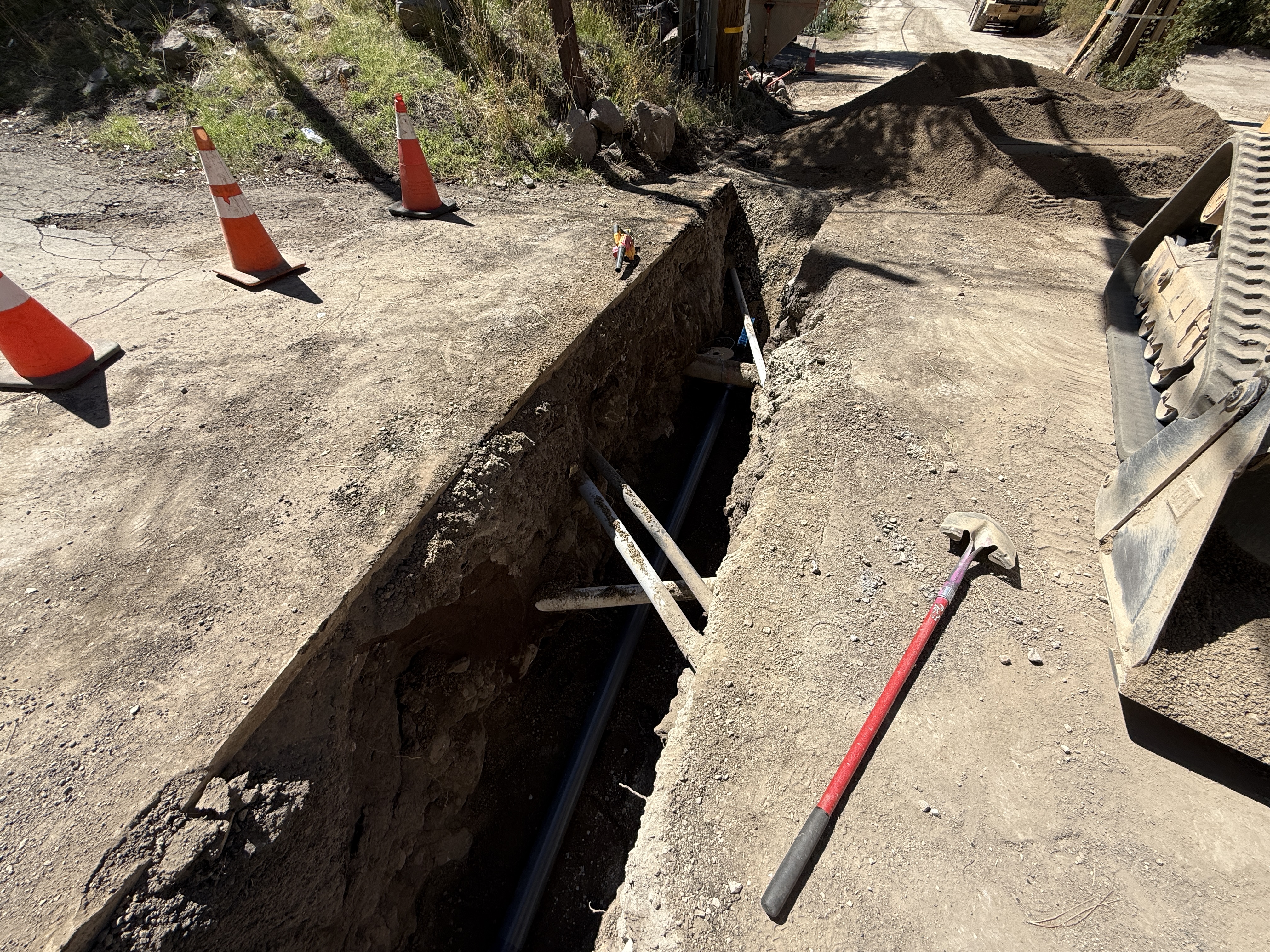 dirt road with open trench daylight with shadows open trench with surrounding cones