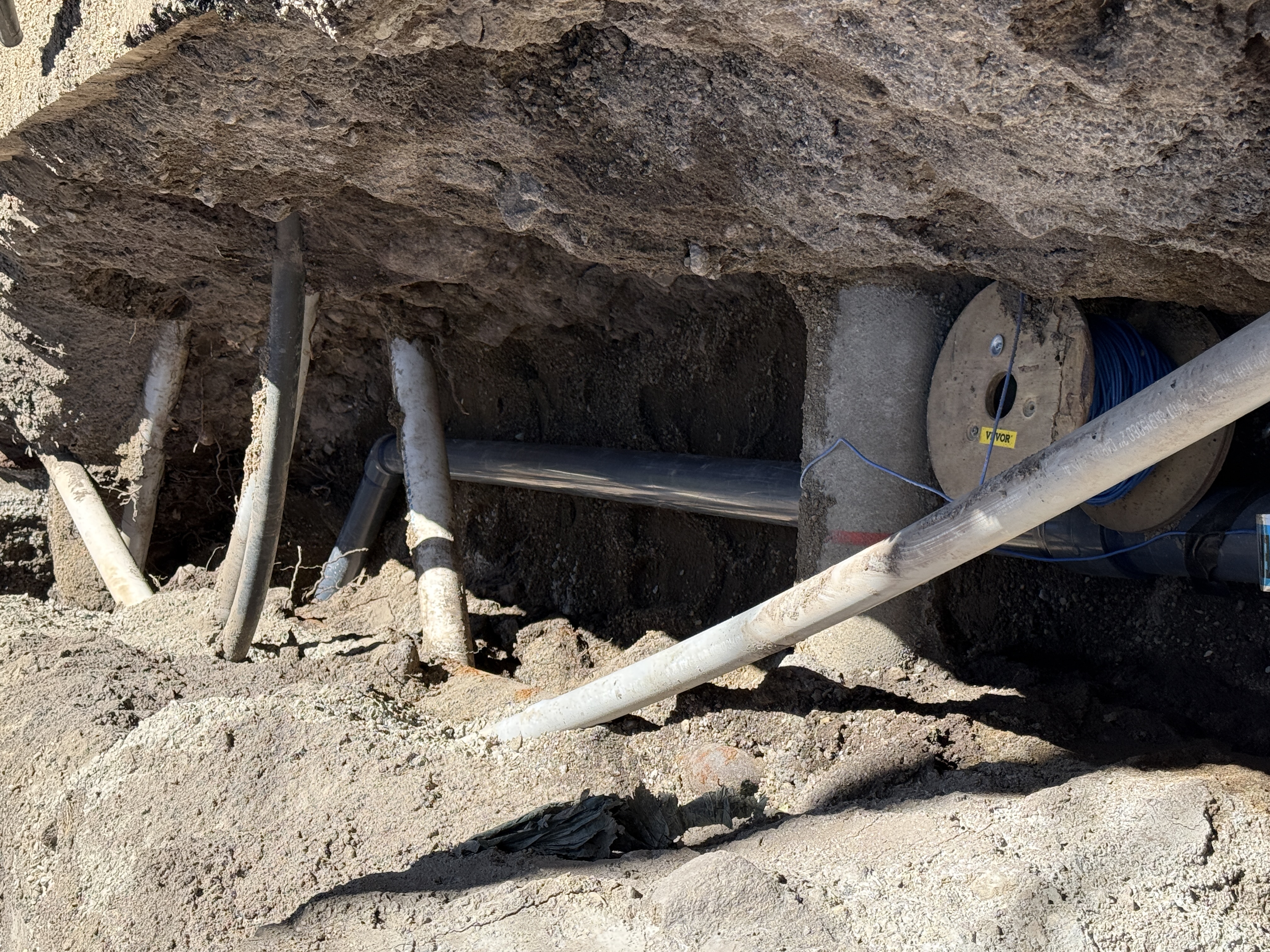 The image shows an open trench with several pipelines and conduits running through it. A spool with blue wire is visible, likely used to pull cables through the conduits. The trench is cut through soil and the pipes run horizontally along the trench. The scene suggests ongoing or recent trenching and conduit installation work.