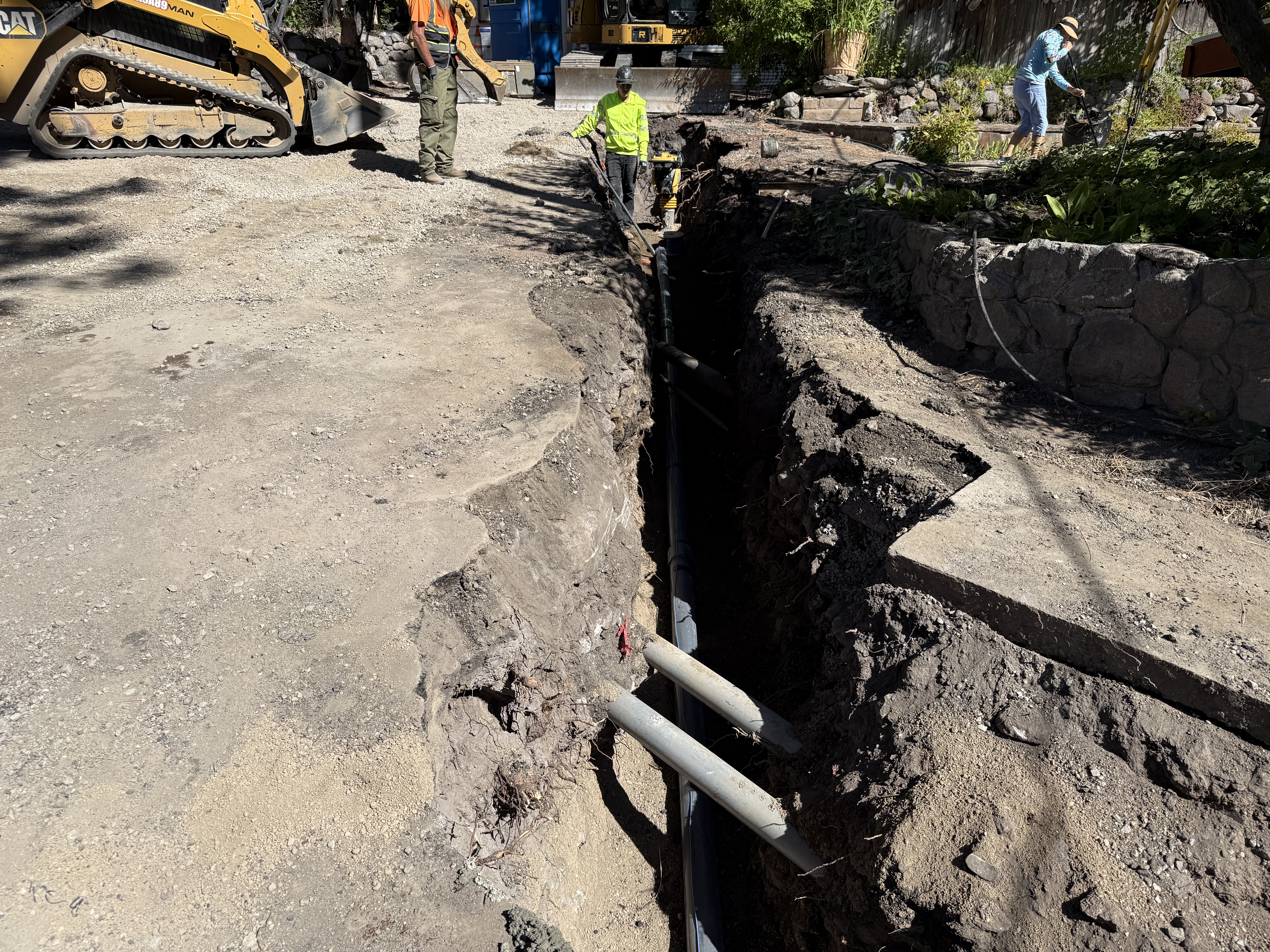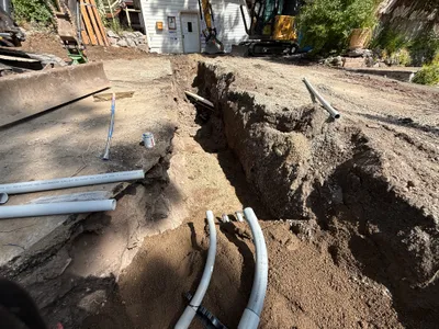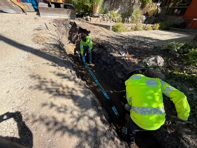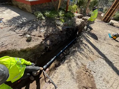 A trench is open with visible pipes laid inside it, suggesting ongoing pipeline installation. Excavation equipment is seen near the trench, with workers actively engaged. The area around the trench appears to have some earthworks and vegetation. Two workers are standing near the trench wearing applicable safety gear.
