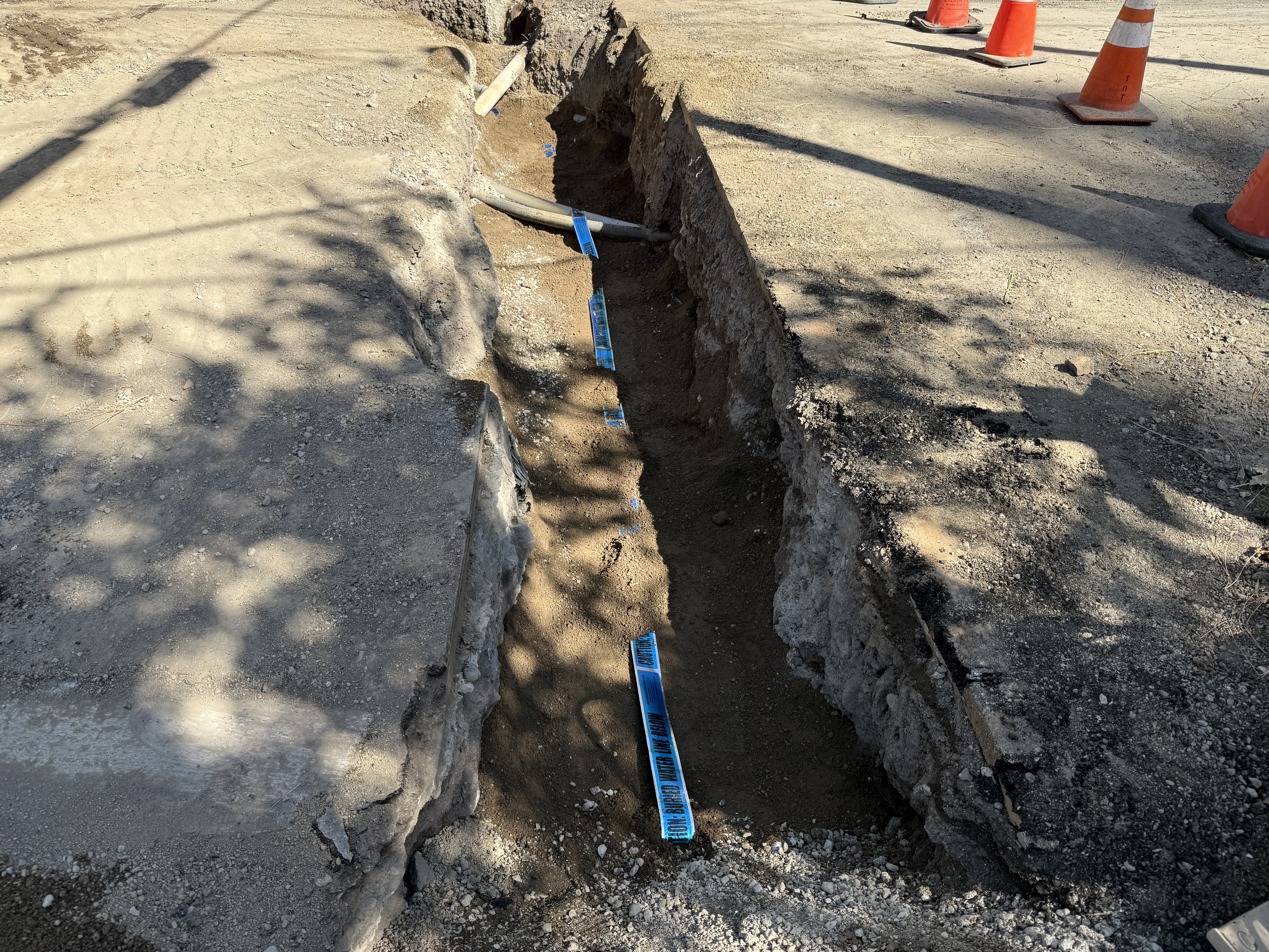 A trench runs across the frame with visible soil and partially exposed pipe. Blue warning tape is laid along the trench, potentially for marking purposes. Orange cones are positioned at the top of the trench, possibly indicating caution or a work zone. The trench appears to be in an unpaved, dust-covered area under daylight conditions.