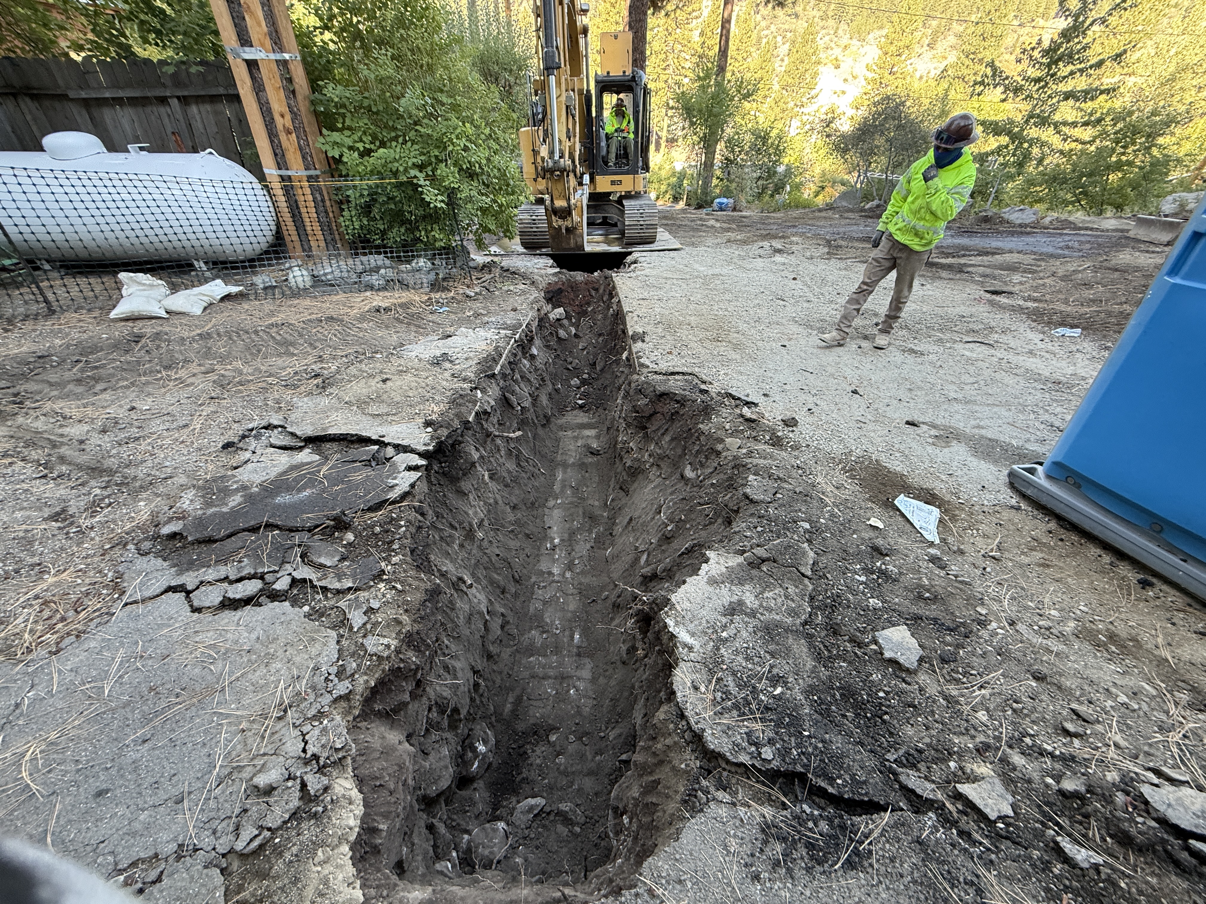 An excavator is actively digging a straight trench in an area with broken asphalt on the surface. A worker wearing a hard hat and hi-vis clothing is observing the operation. The surrounding area includes a propane tank and temporary fencing, with a portable toilet nearby. The trench appears to be freshly dug, with the soil laid out alongside the opening.