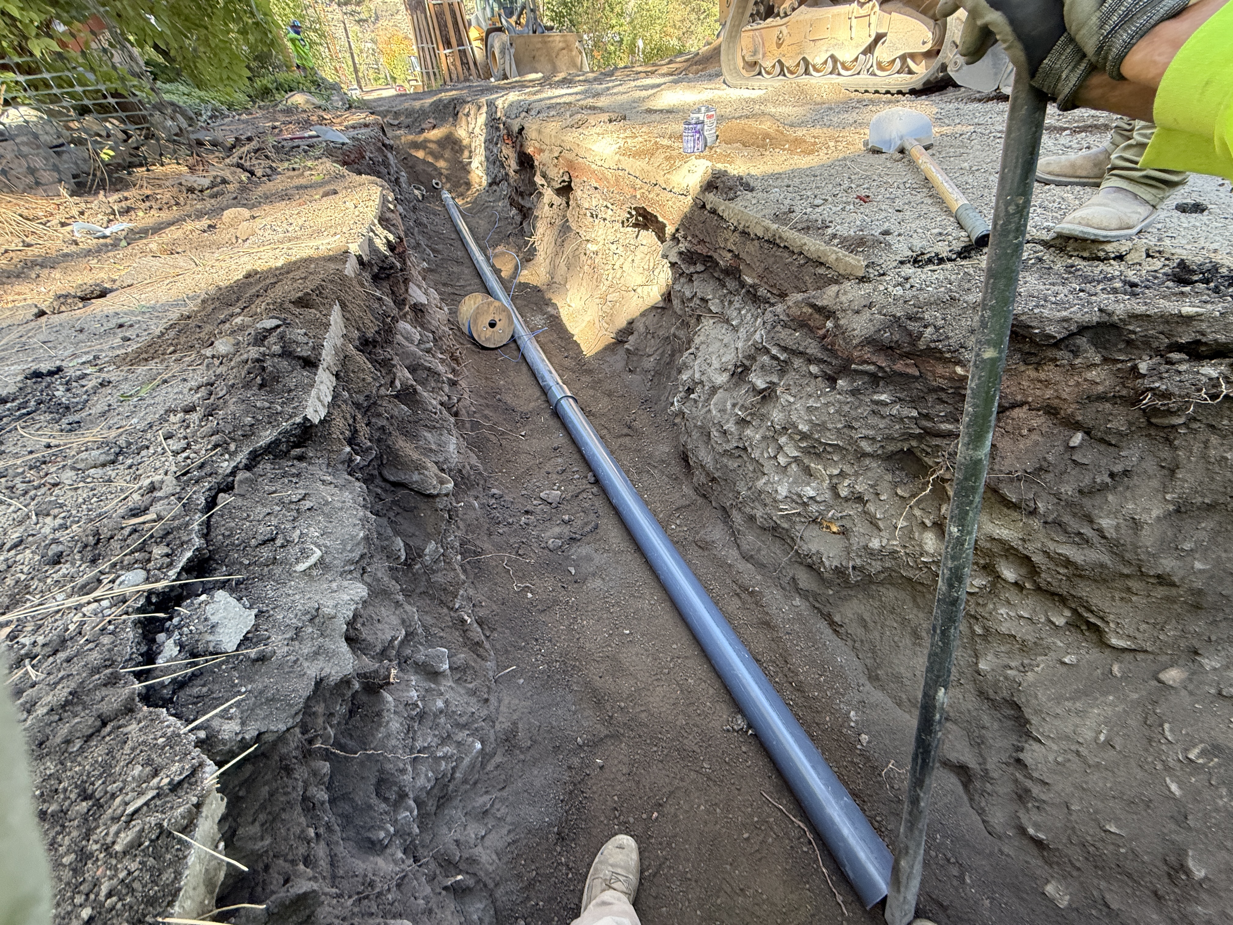visible soil and pavement under and around trench clear daylight open access to work area with visible equipment