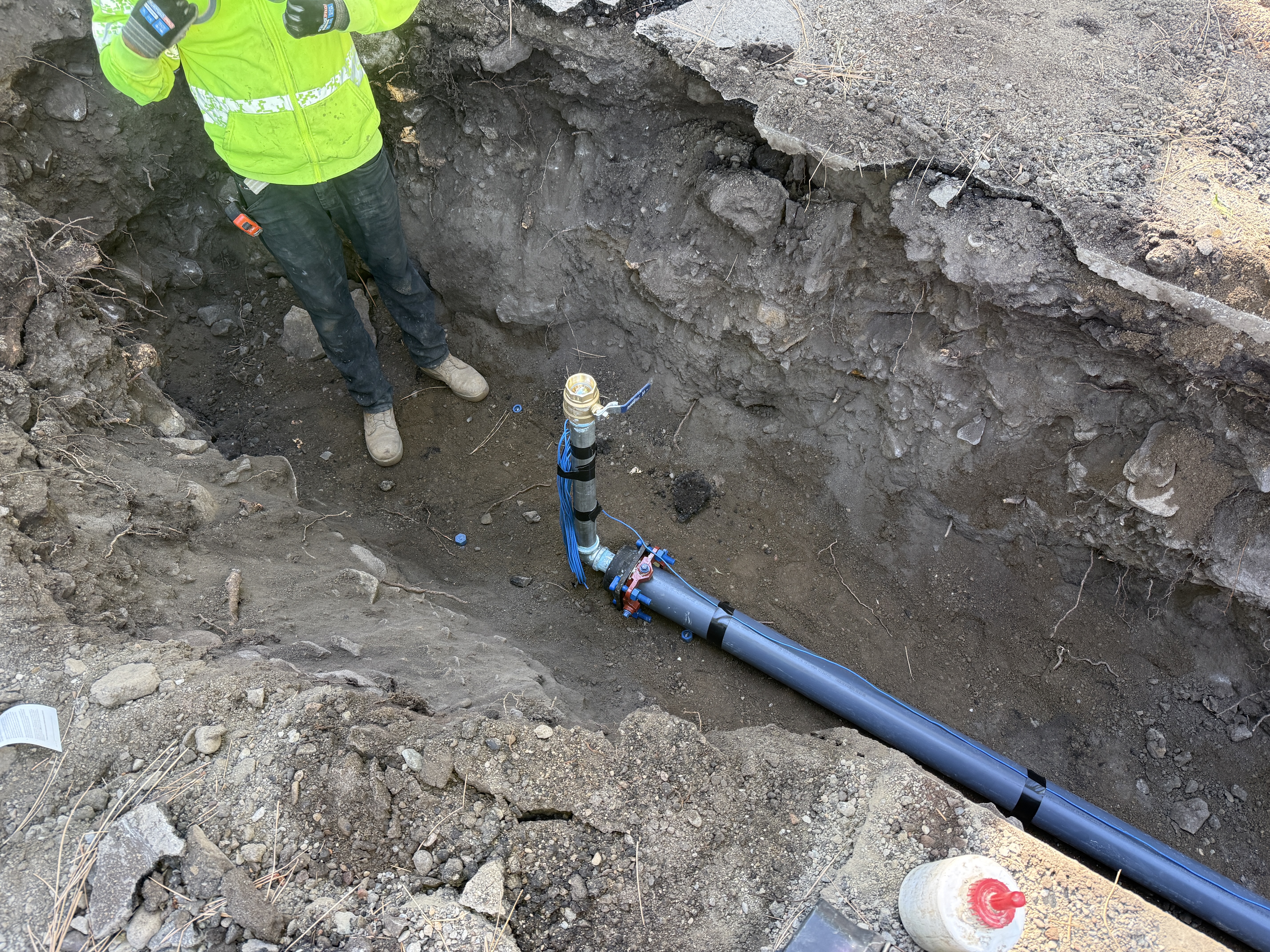 The image shows a trench with a section of black plastic pipe being installed or inspected. A worker wearing a hi-vis jacket and work boots is present in the trench. Joint fittings are visible on the pipeline. The trench appears to be freshly dug with soil and rock edges.