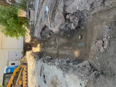 PPE such as hi-vis vest and work boots are visible. Open trench presents a hazard.