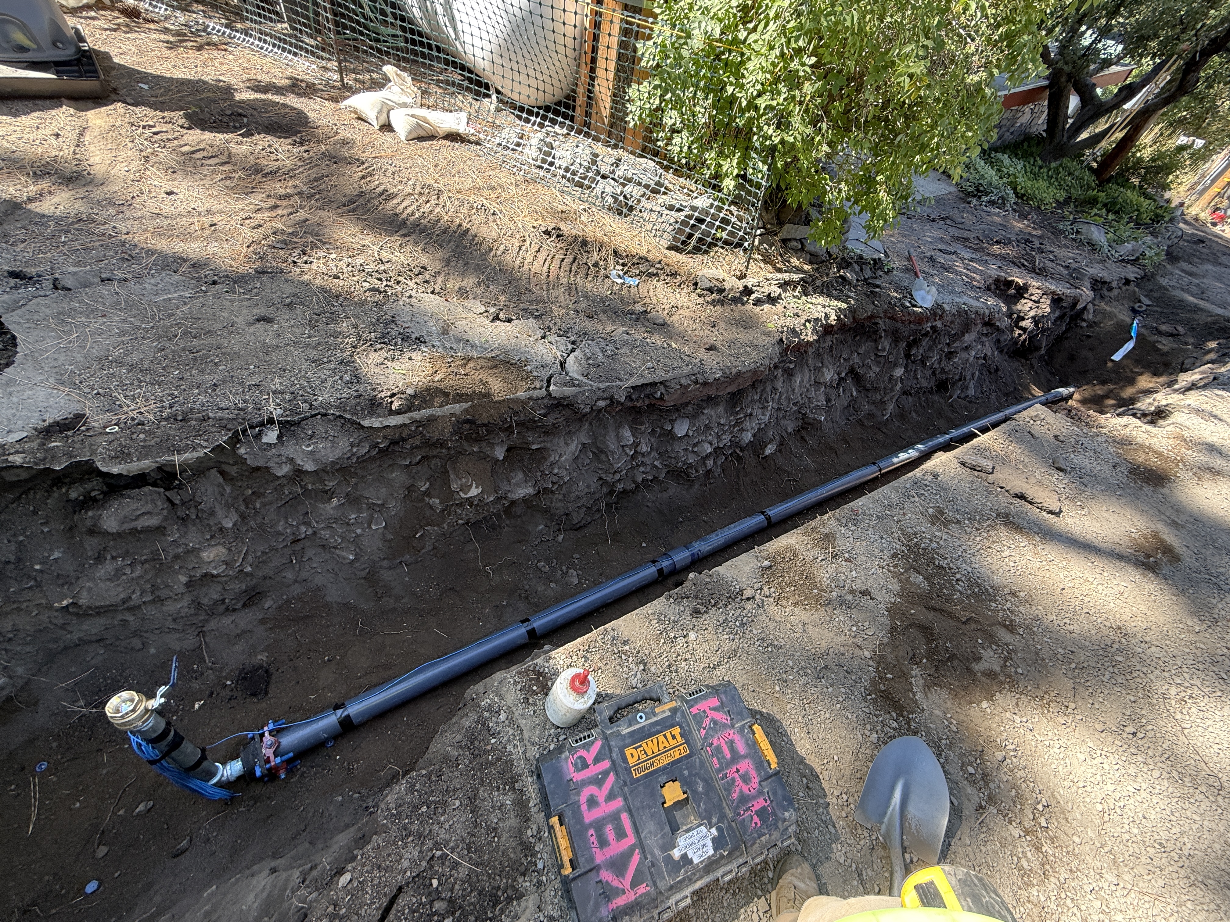 An open trench extends along the ground with a black pipeline placed inside it. At the far end of the trench, a connection assembly is visible with a meter or valve component. A tool box and a shovel are positioned on the surface above the trench. The area appears to be in an excavation site with surrounding soil and trees.