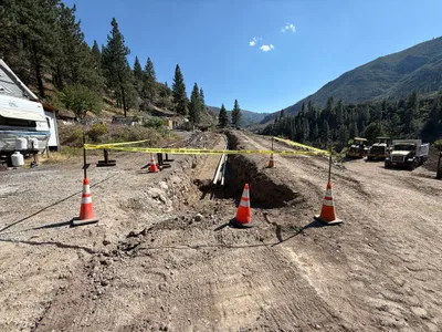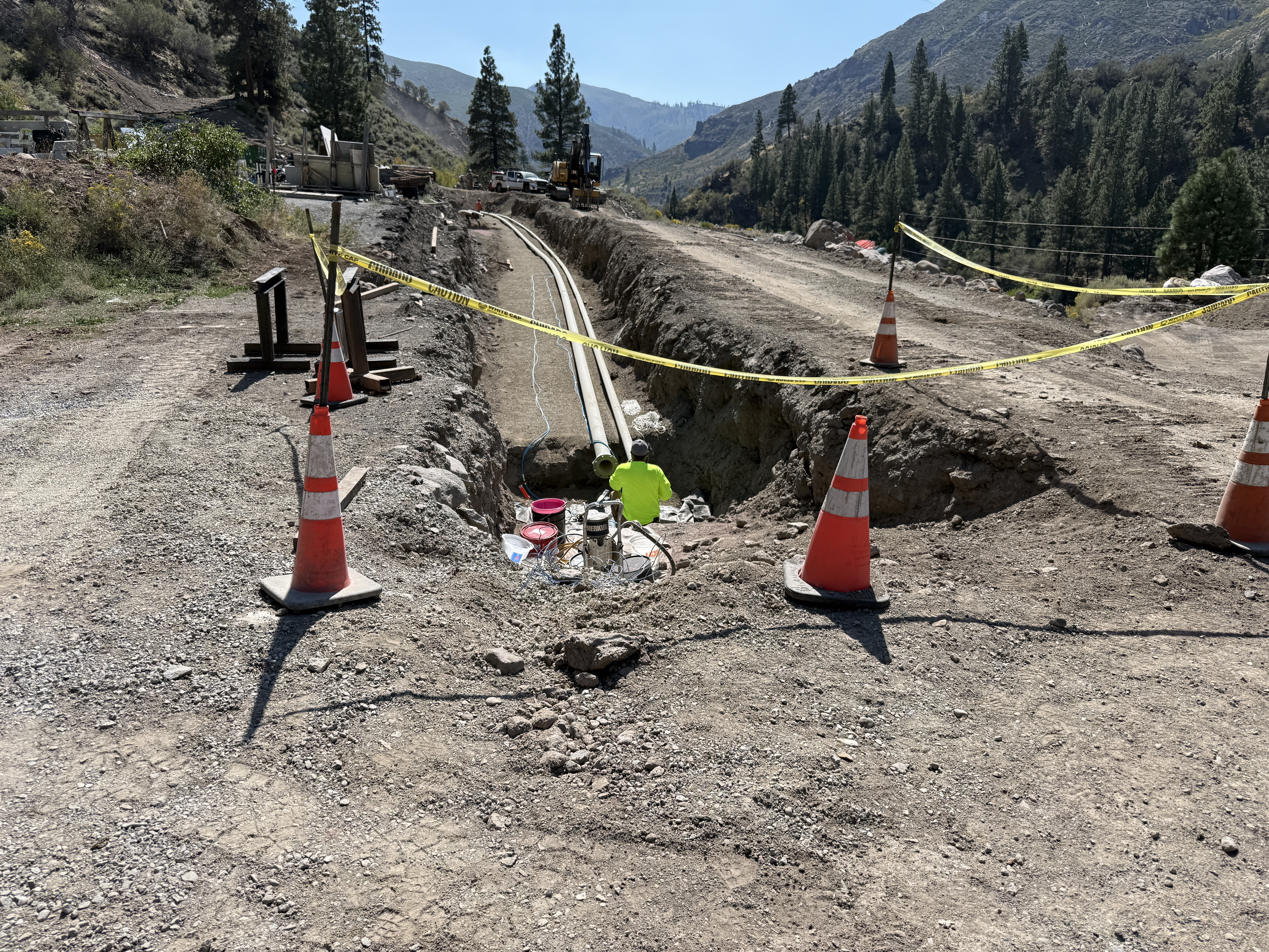 Trenching area is marked with cones and caution tape for safety.