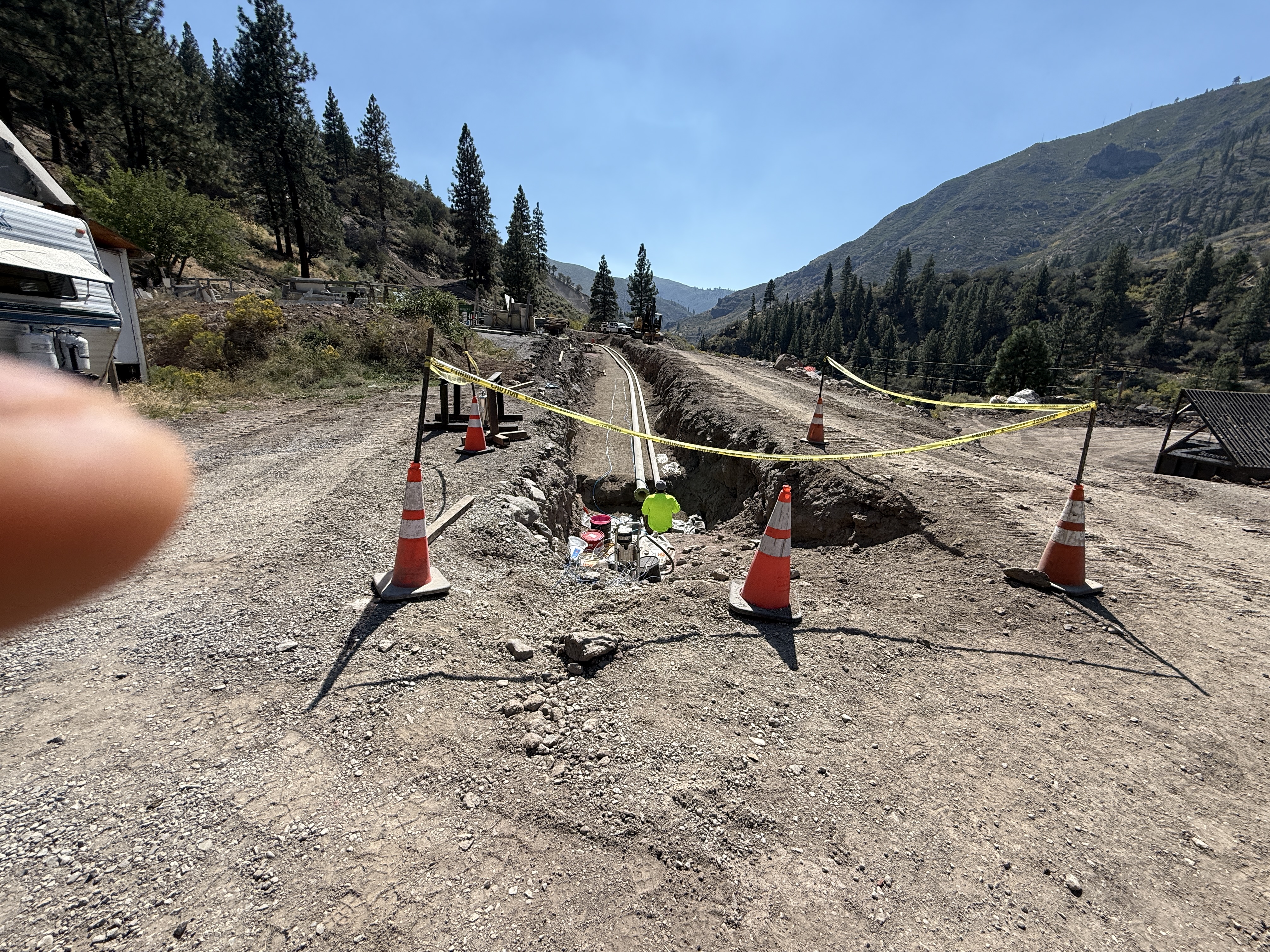 The image shows an open trench in a dirt area running alongside a gravel path. The trench contains visible piping, and is bordered by orange traffic cones and caution tape for safety. There are hills and trees in the background, indicating a rural location. A visible finger partially obstructs the left edge of the image.
