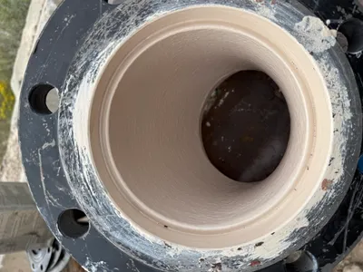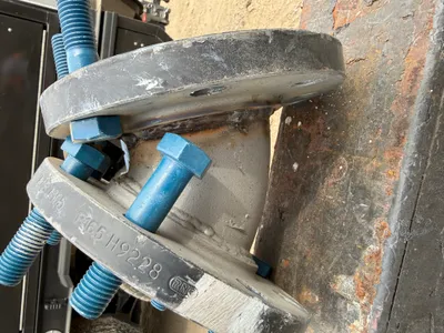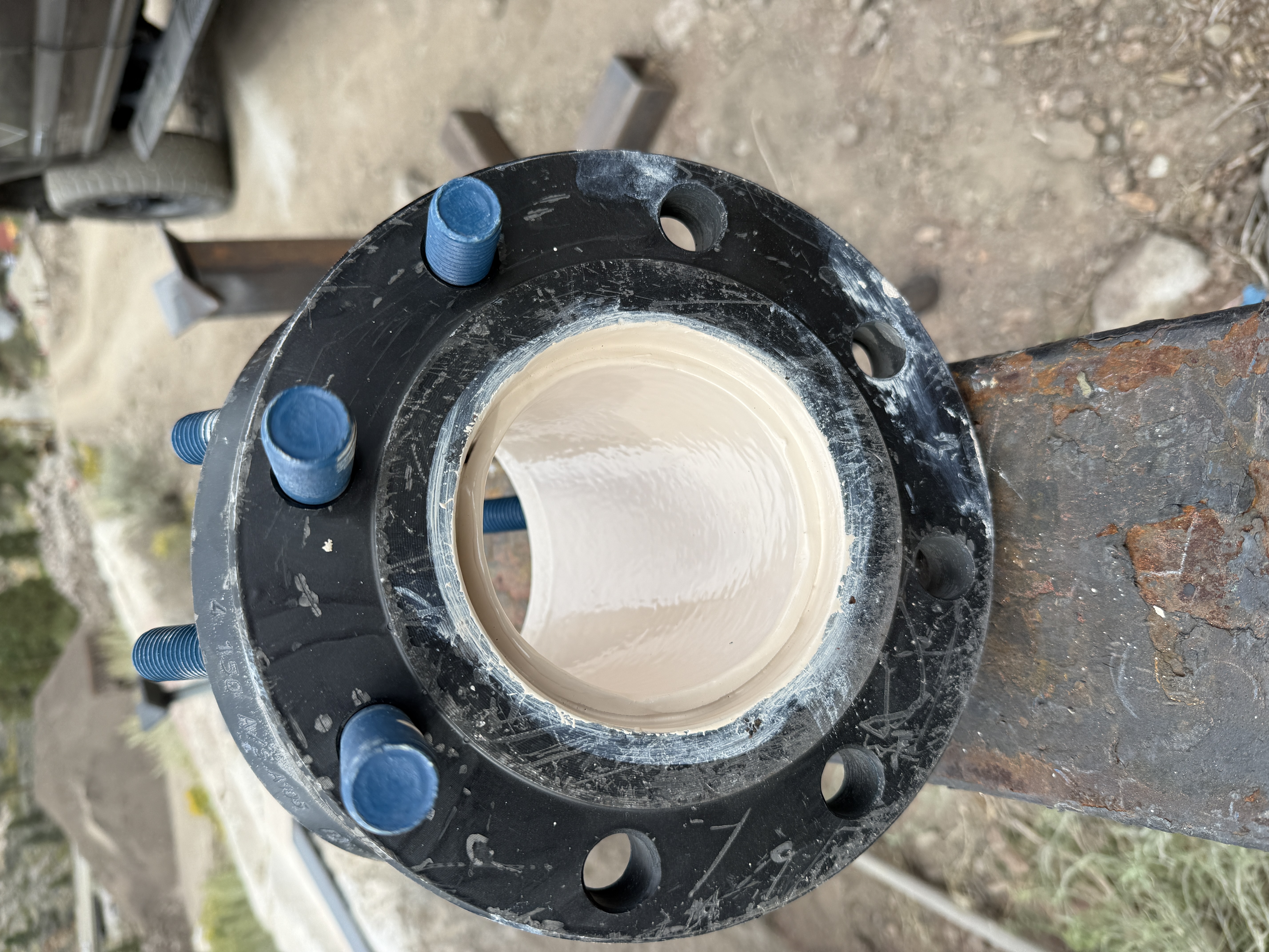 The image shows a close-up of a flanged pipe section with visible bolts and a flange. The scene is positioned on uneven ground with a vehicle in the background. The flange has multiple bolt holes and is partially fastened. This setup is likely part of a piping installation project.