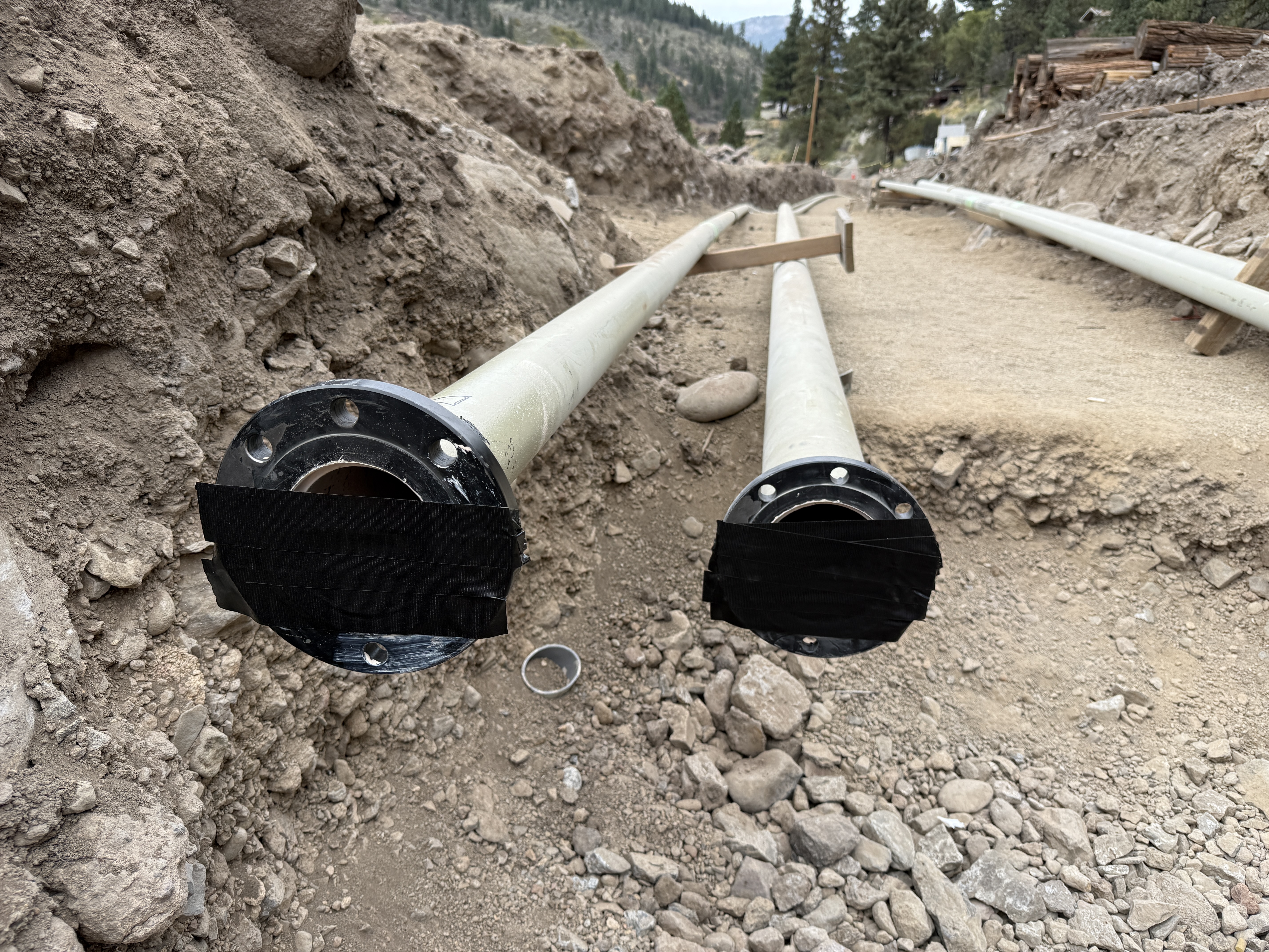 Two large pipes are placed parallel on an excavated trench, both with flanges and ends taped with black tape. The background shows an ongoing trench with earth piled on the sides, and the setting has a clear path along the trench indicating possible pipeline installation work. The surrounding environment is rocky and appears to be in a mountainous area.