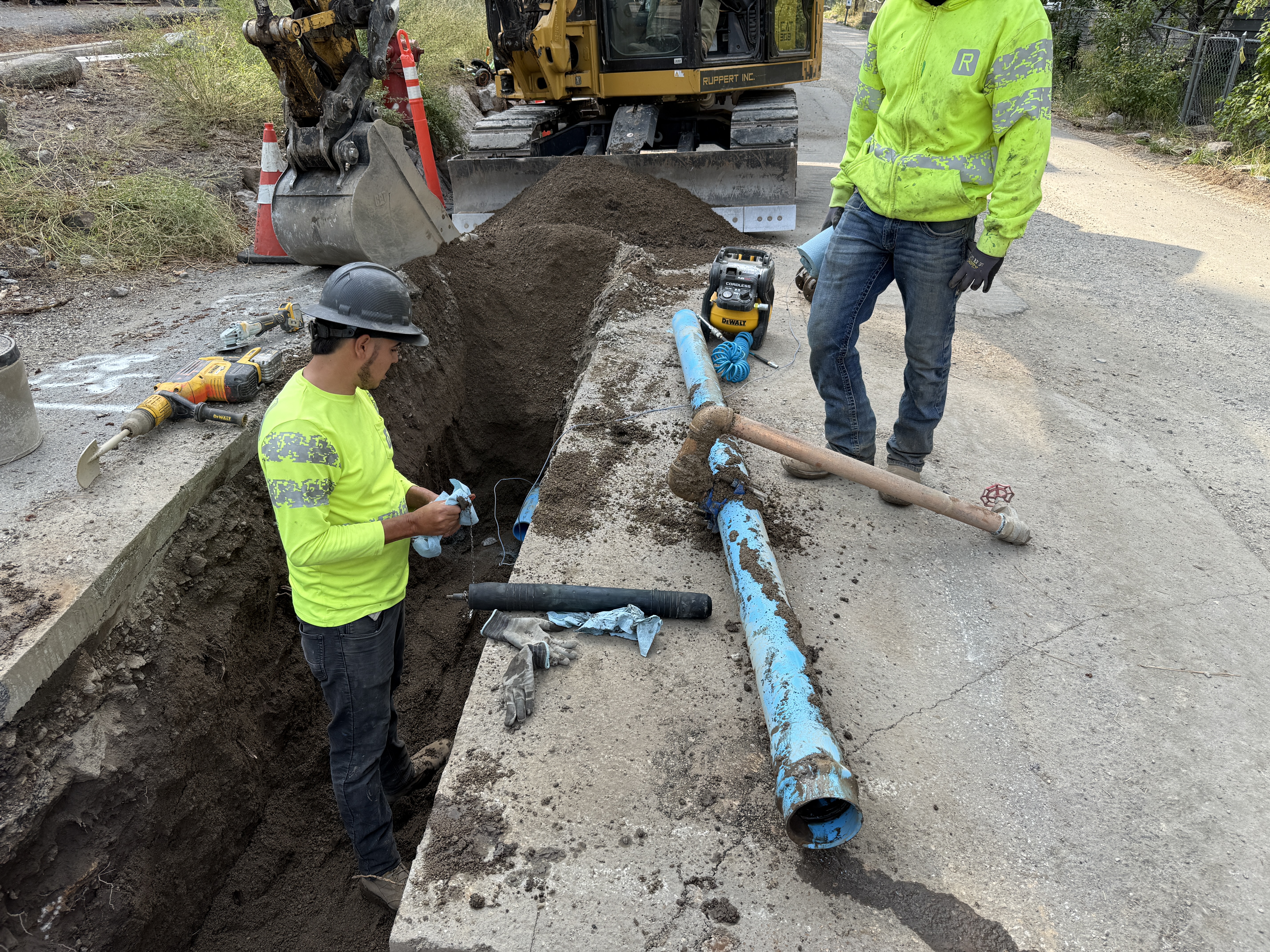 The image shows two workers near an open trench, one inside and one on the edge. They appear to be installing or inspecting blue piping sections. An excavator is parked near the trench with cones around it, indicating active use. There is disturbed soil suggesting recent excavation work. Various tools are visible on the ground and a compact soil compactor nearby.