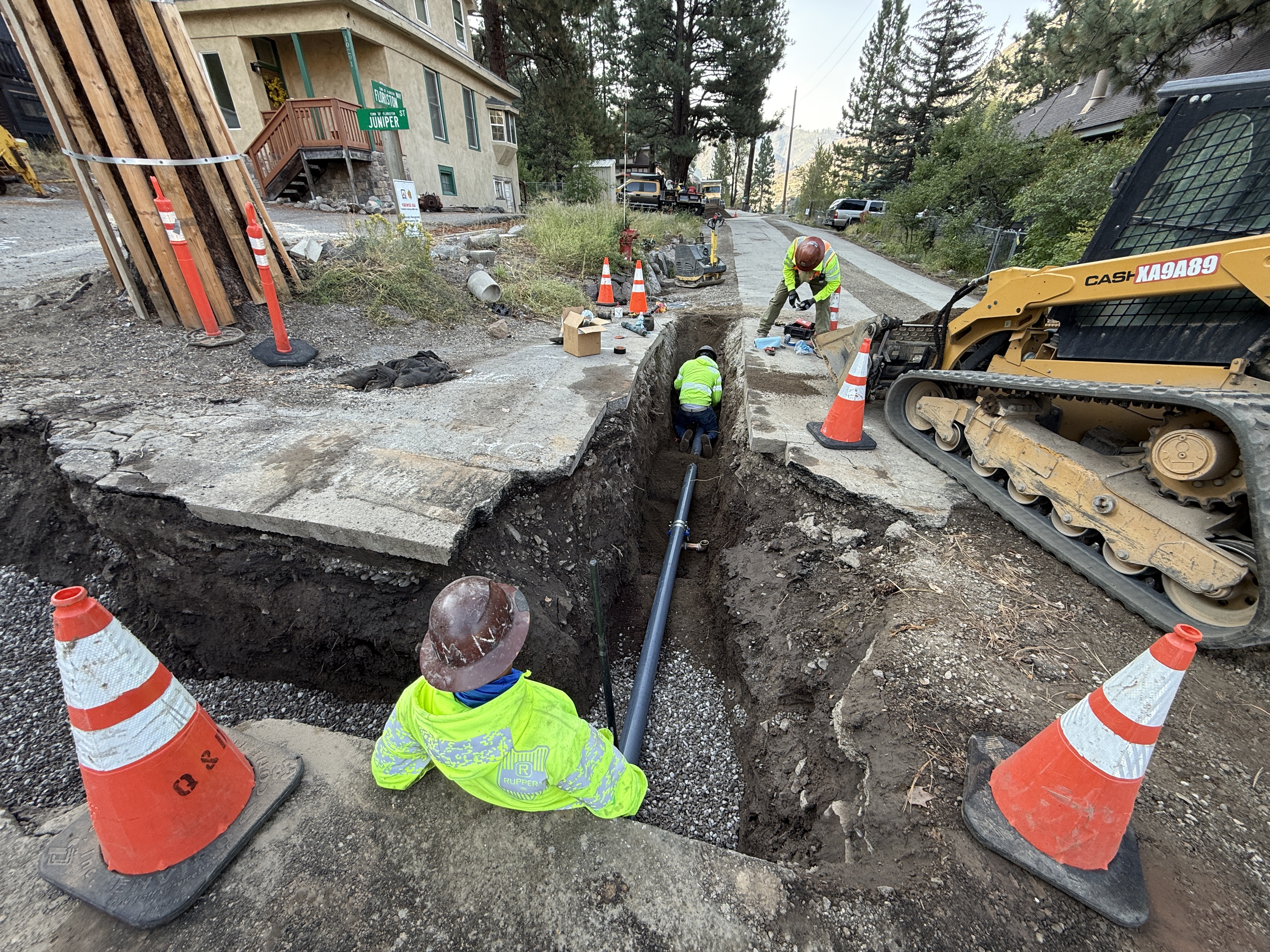 The image shows three workers actively working in and around a trench for pipeline installation. One worker is positioned inside the trench aligning a pipe, while two others are on the surface nearby. Heavy machinery, specifically a track loader, is adjacent to the trench, indicating ongoing construction activities. Traffic cones mark the perimeter of the site, and gravel is visible around the trench.