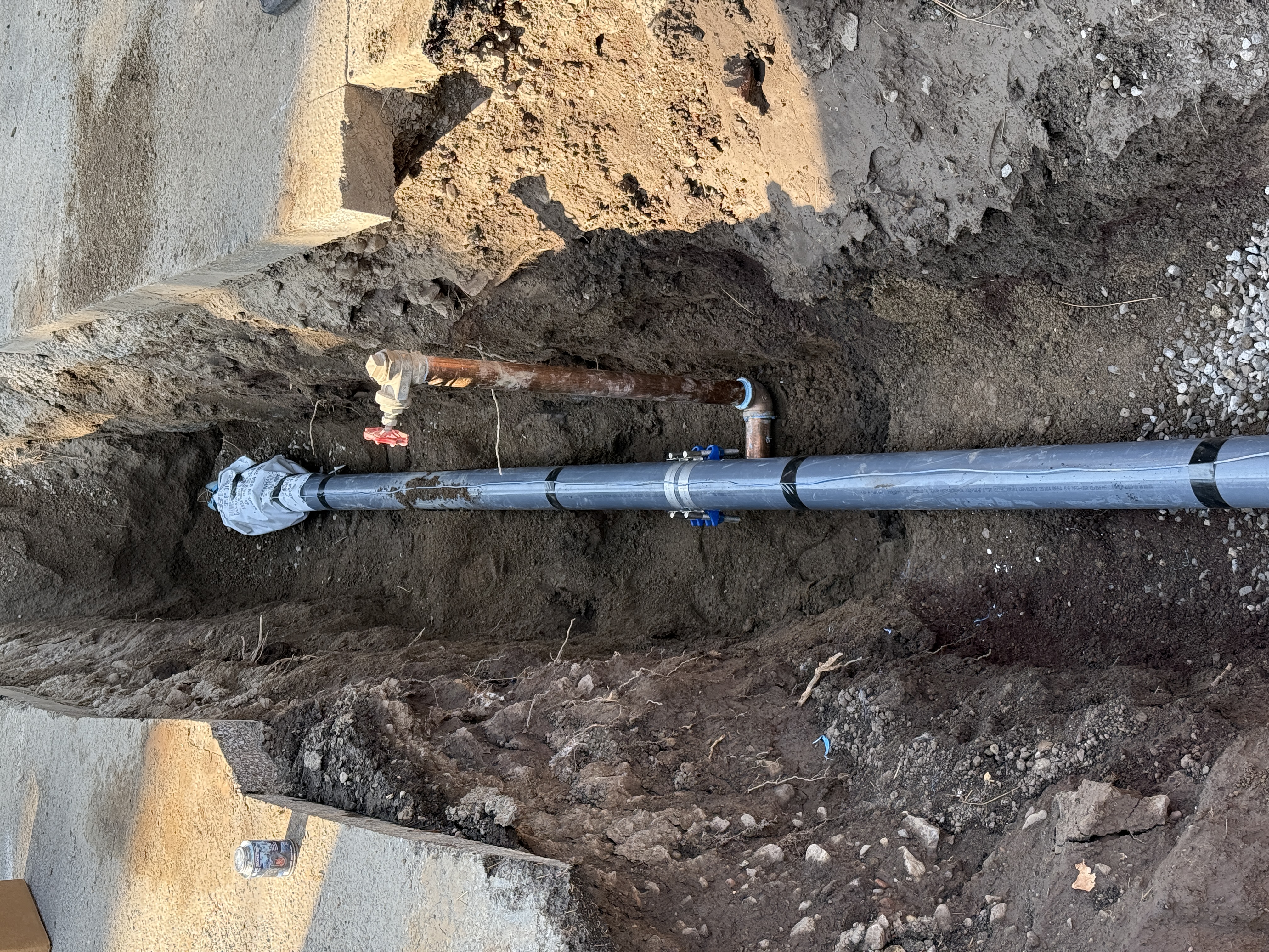 The image shows a trench with a partially installed pipeline. A pipe runs horizontally, secured with connectors and possibly wrapped at one end. A copper pipe with a valve is also visible. The area is surrounded by soil and some concrete sections are suspended above the trench edges.