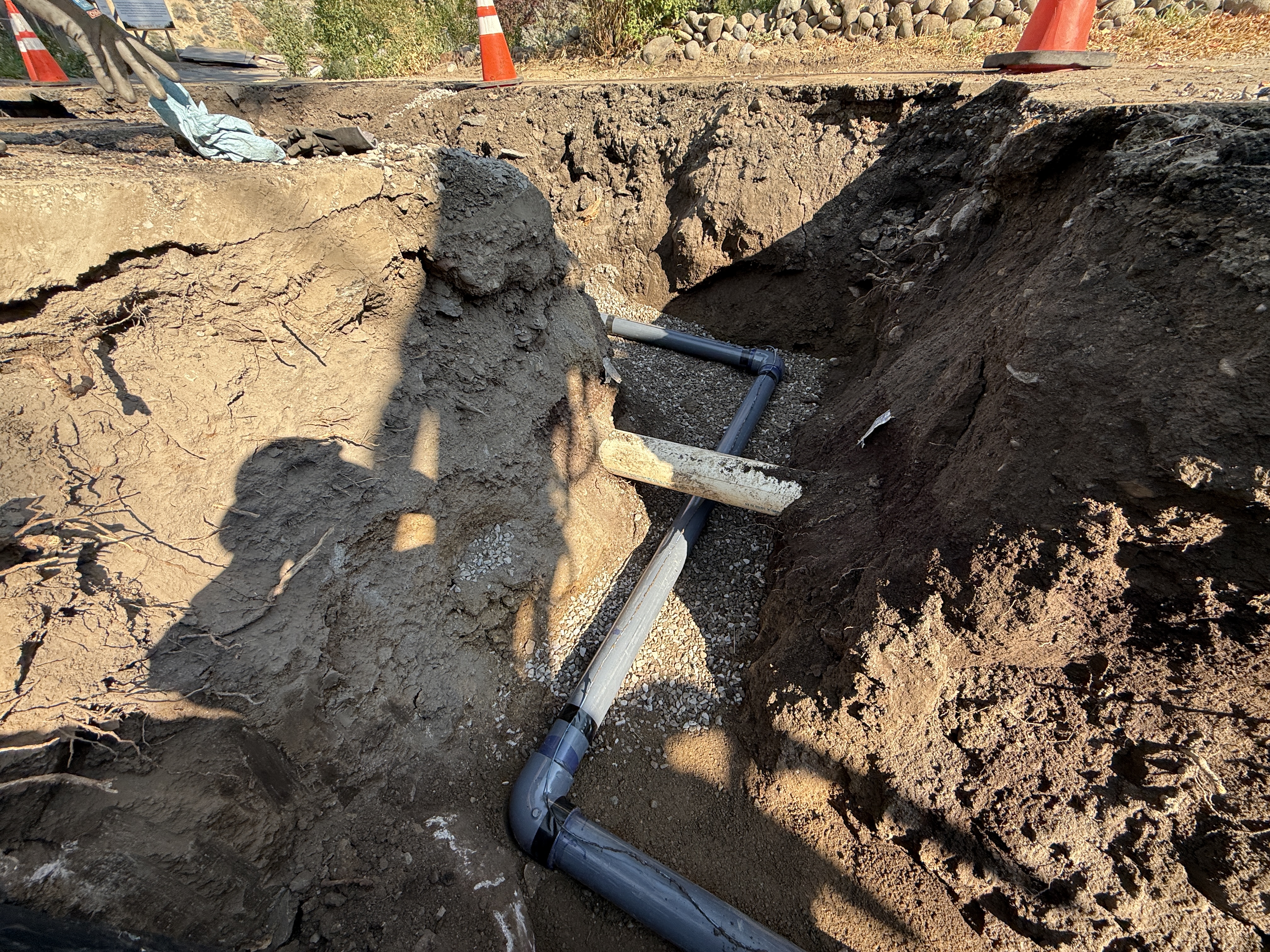 The image shows a trench containing newly installed plastic pipes, likely for utility or drainage. The trench is surrounded by soil and partially filled with gravel. Several traffic cones are positioned around the area, indicating ongoing work and awareness for safety. The photo includes shadows of workers, suggesting active presence but no PPE is clearly visible.