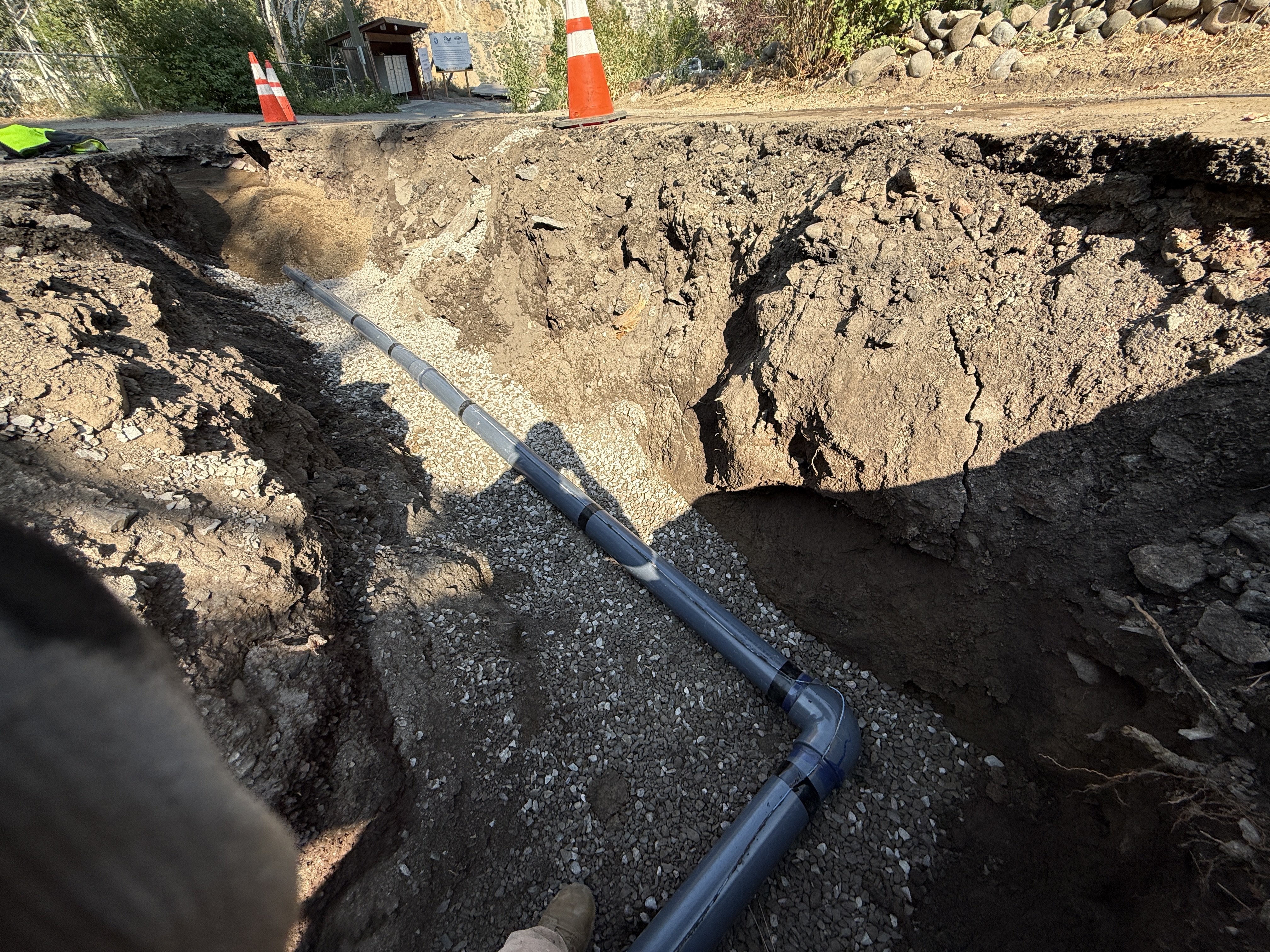 The image shows an open trench with PVC pipes being laid along a gravel base. Two traffic cones are positioned at the edge of the trench, likely indicating a work zone. The trench appears to be in a rural or wooded area, judging from the surroundings.