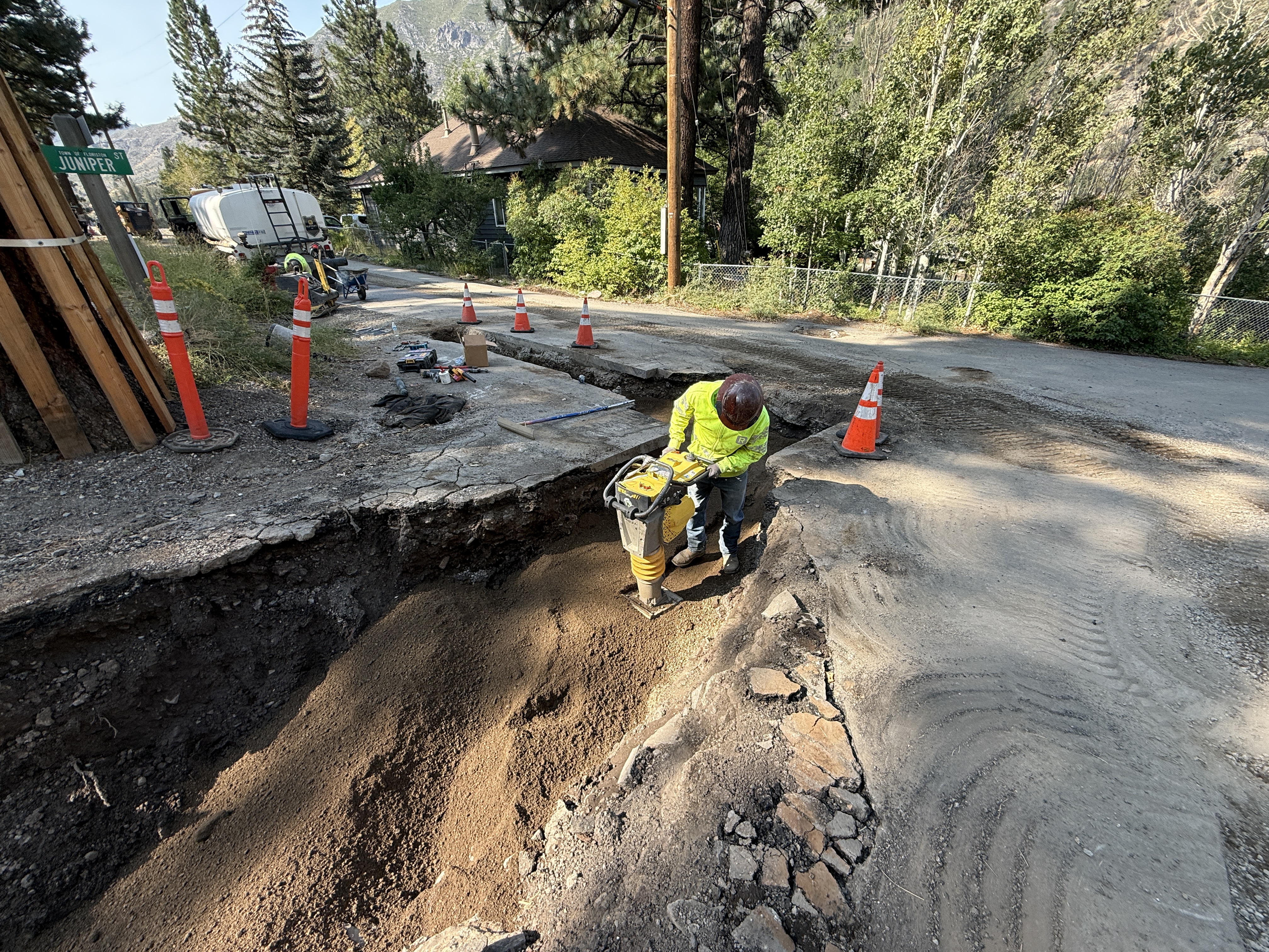 A construction worker is using a vibratory compactor on soil within a trench in a road. The worker is in the foreground wearing hi-vis safety gear. Traffic cones are placed around the trench for safety. Hand tools are laid out near the edge of the trench, and a dirt road and vegetation are visible in the background.