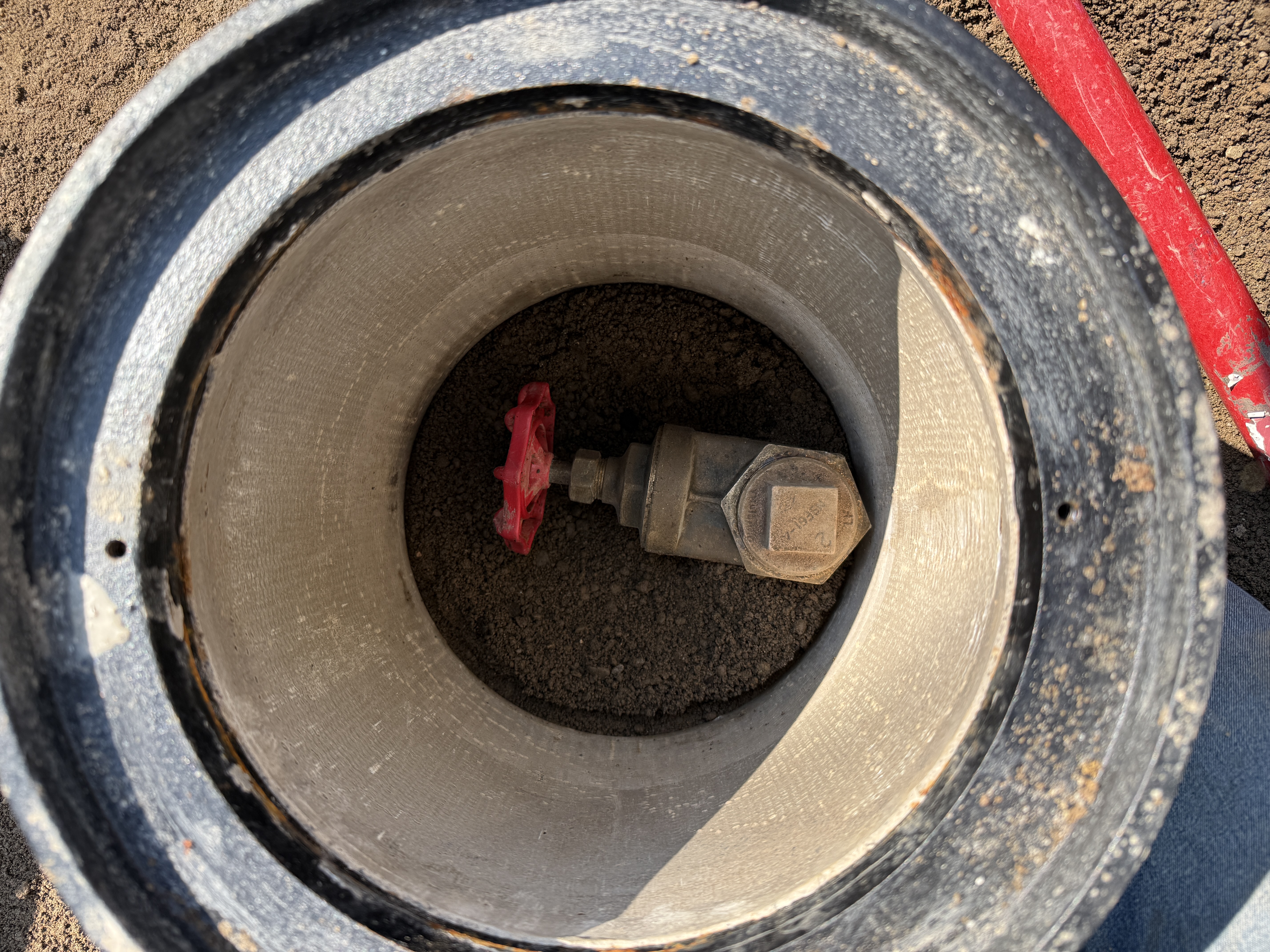 A valve assembly with a red handle is located inside a cylindrical utility vault. The valve is mounted at the bottom, surrounded by soil. The vault is made of a rigid material and appears to be set into the ground, with the top edge visible. The image captures a clear view straight down into the vault.