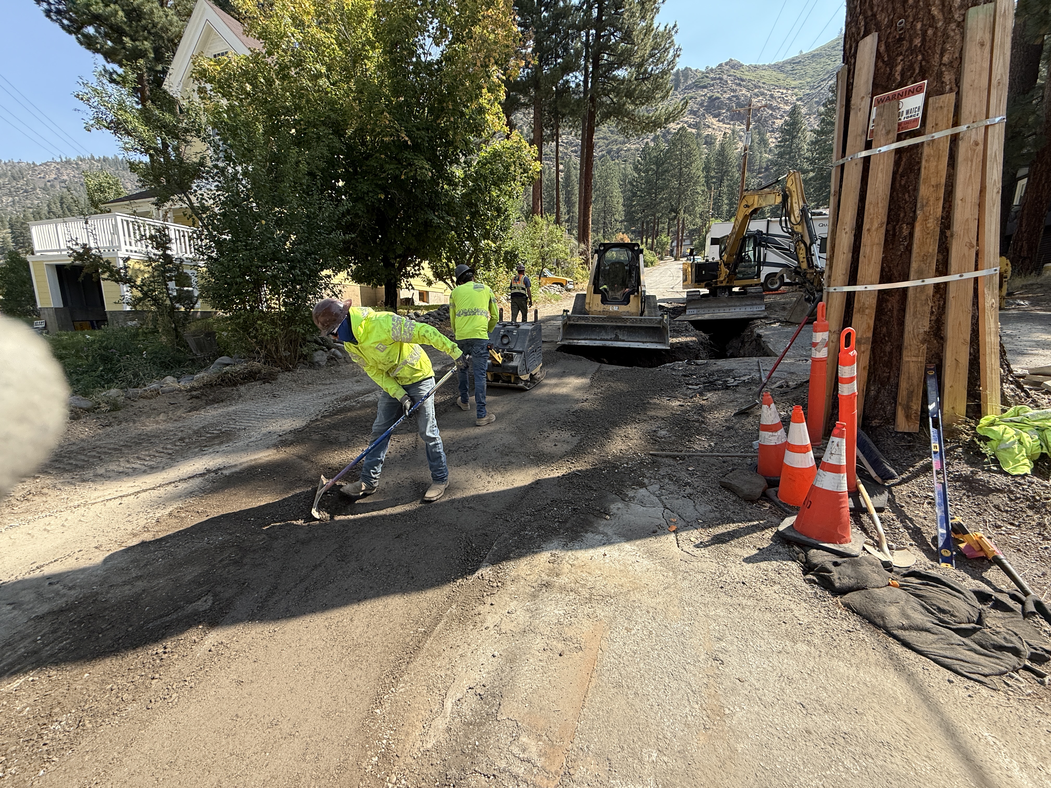 The image shows a worker using a rake to spread asphalt on a road while other crew members and construction equipment, including a skid-steer loader and a mini excavator, are present. Traffic cones are set up to indicate the work area. A trench is visible near the excavator. The scene is outdoors with trees and a house in the background.