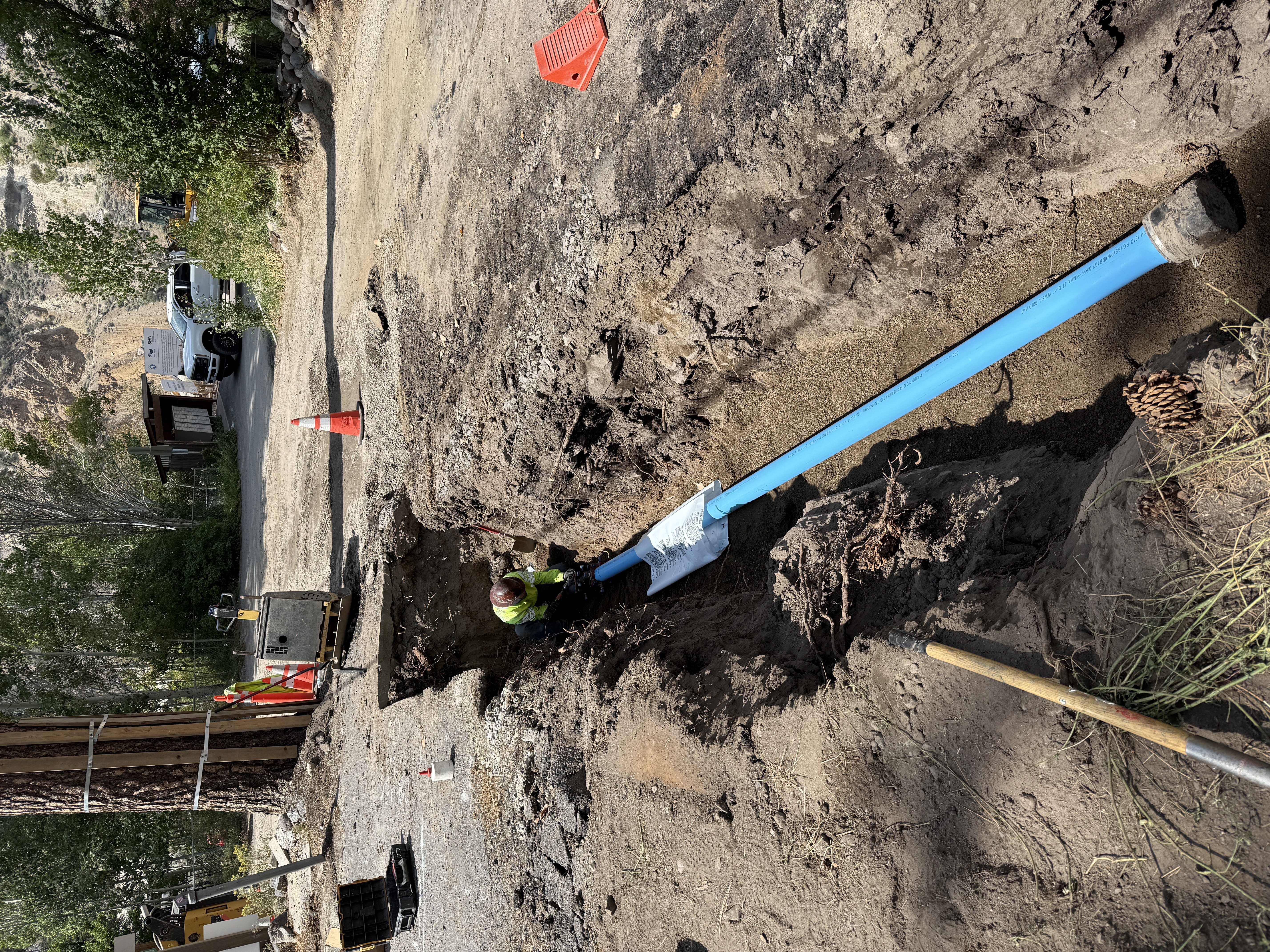 The image shows a person in a trench working on installing a blue pipe. The pipe is laid in the center of a trench created in soil, extending towards the foreground. Construction cones and some portable equipment are set up nearby. The surrounding area includes dirt and some construction debris.