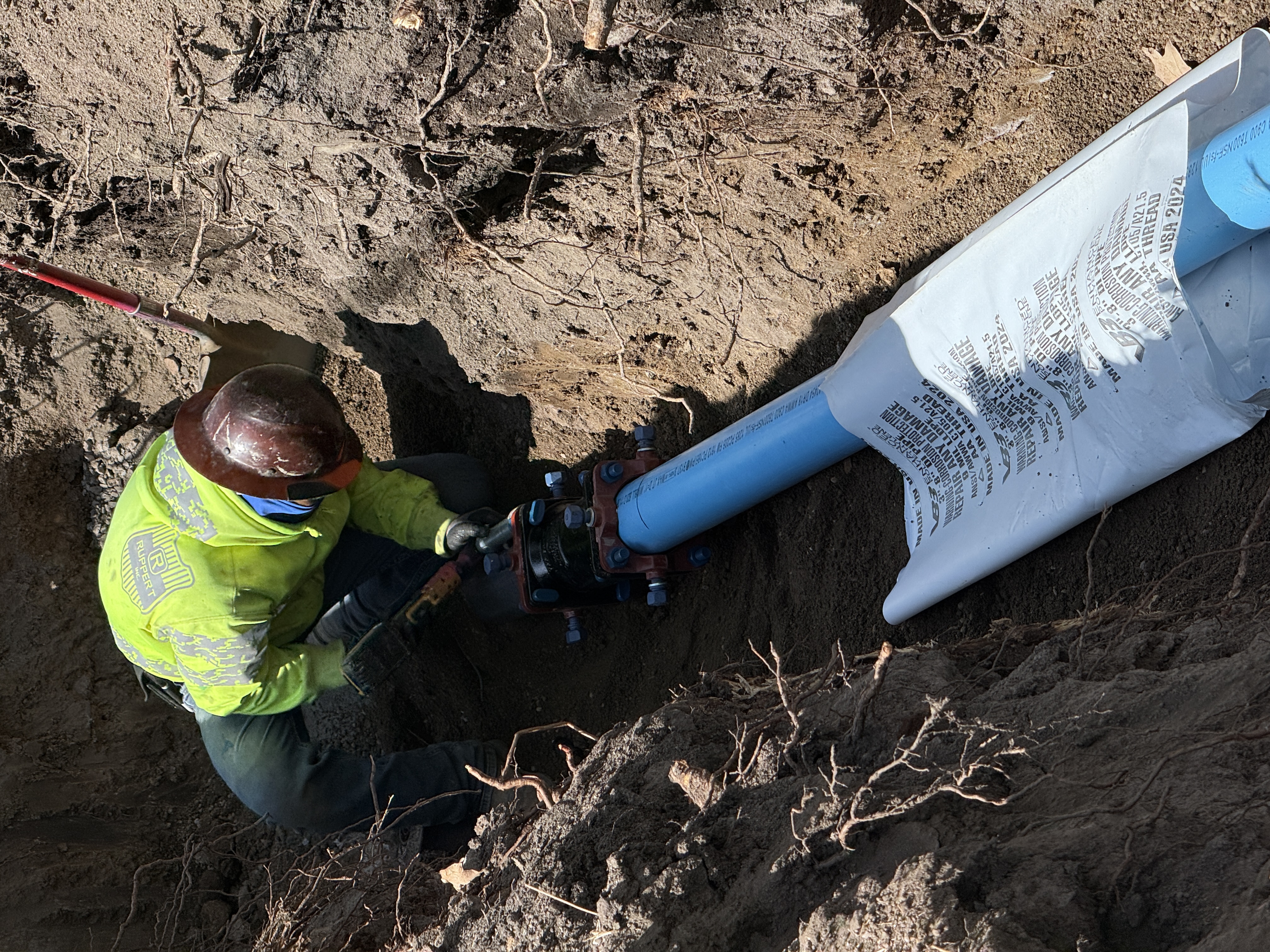 A worker wearing a hard hat and hi-vis jacket is seen kneeling in a trench, working on a blue pipeline. The trench is surrounded by dirt and roots are visible around the area. A wrapped pipeline component is visible, and the worker appears to use a wrench-like tool. There is no visible heavy machinery or vehicles in the frame.