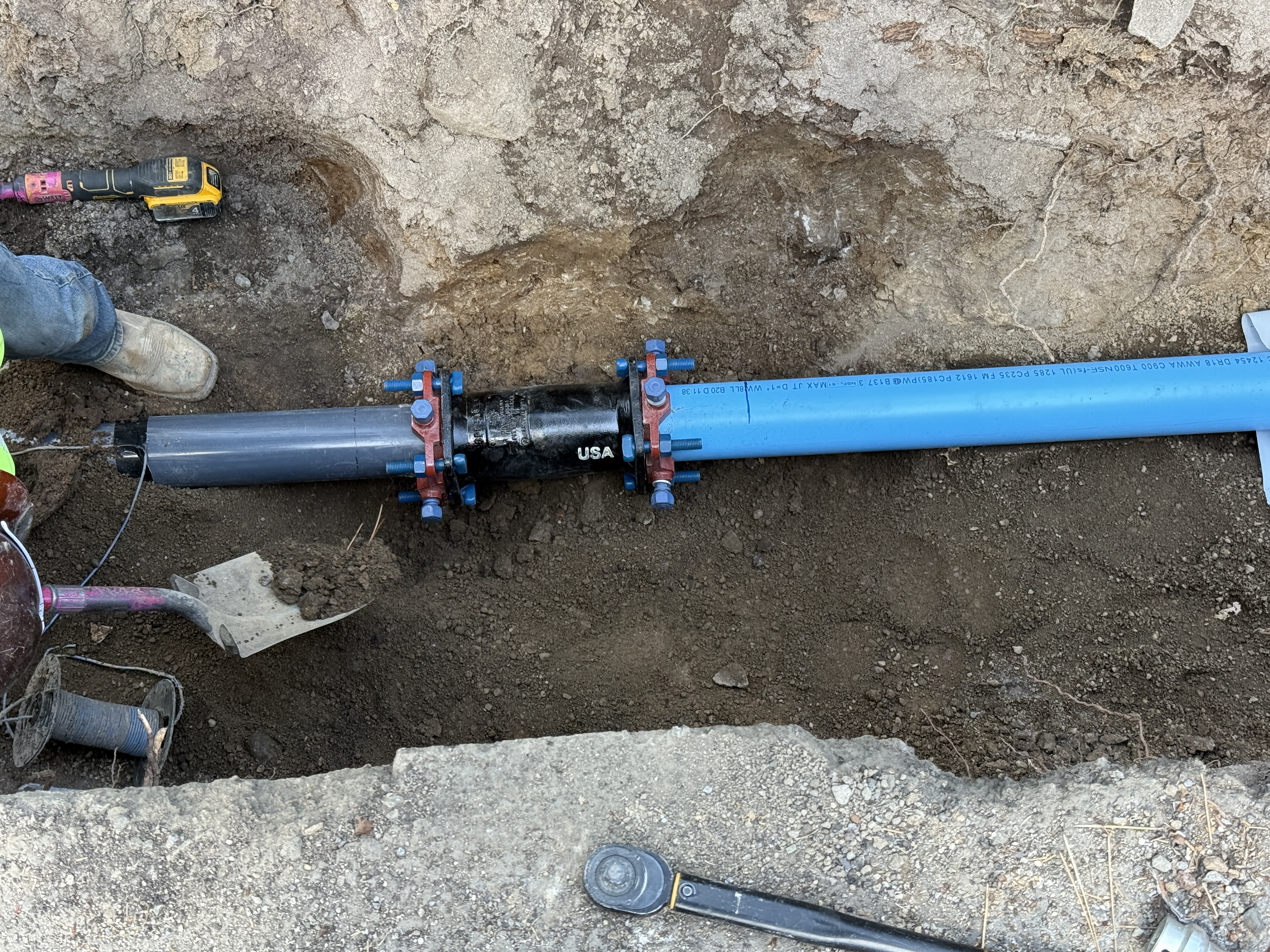 The image shows a section of a blue pipeline being installed in a trench. It is connected to a black pipeline via pipe couplings. A worker's foot is seen at the top right corner, along with a cordless drill and a shovel nearby. Soil surrounds the pipes in an open trench.