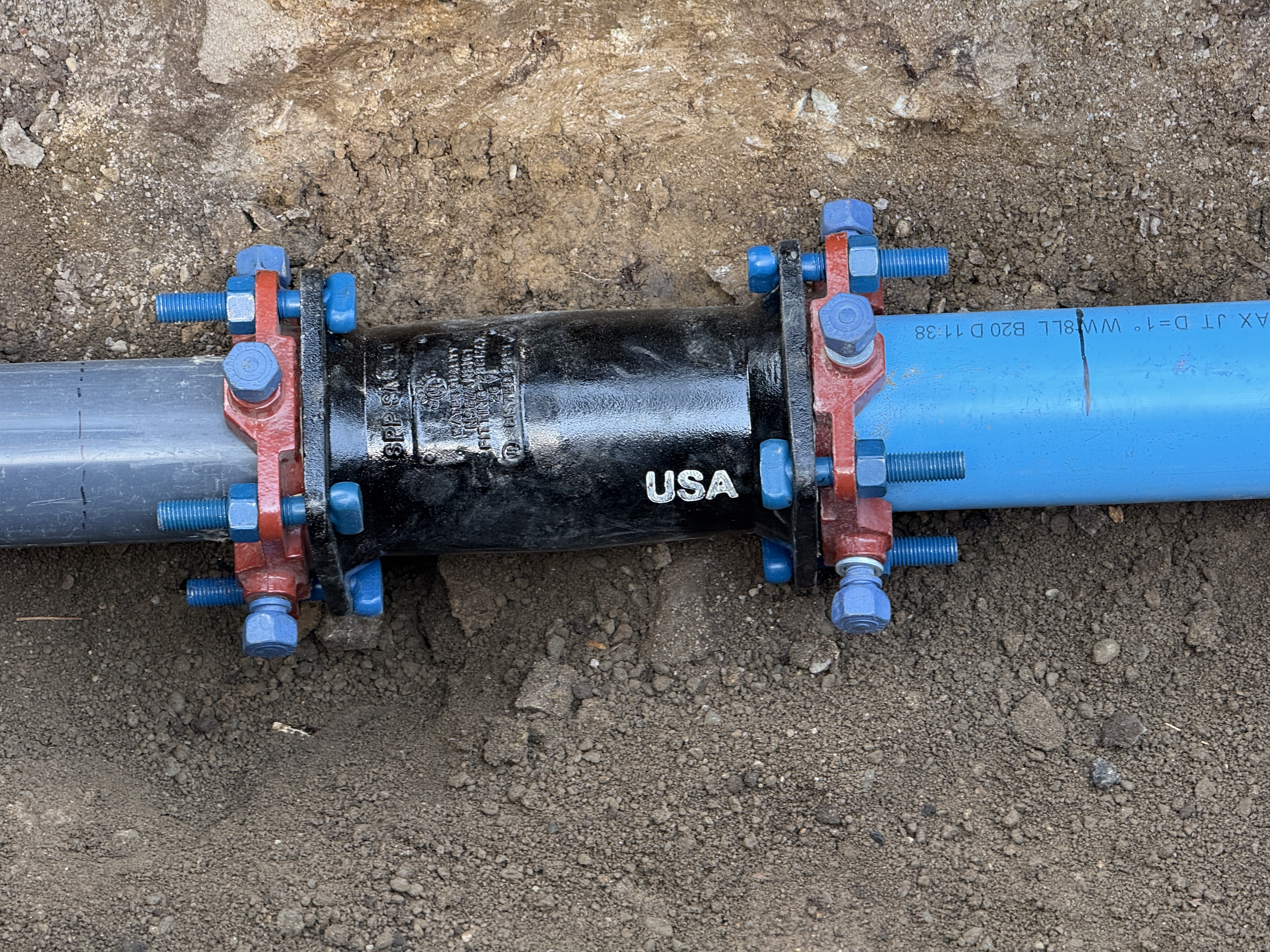 The image shows a freshly installed pipeline connection. Two different colored pipes are joined using flange couplings fastened with bolts. The flange couplings are secured with blue bolts and a red bracket. The surrounding surface is exposed soil.