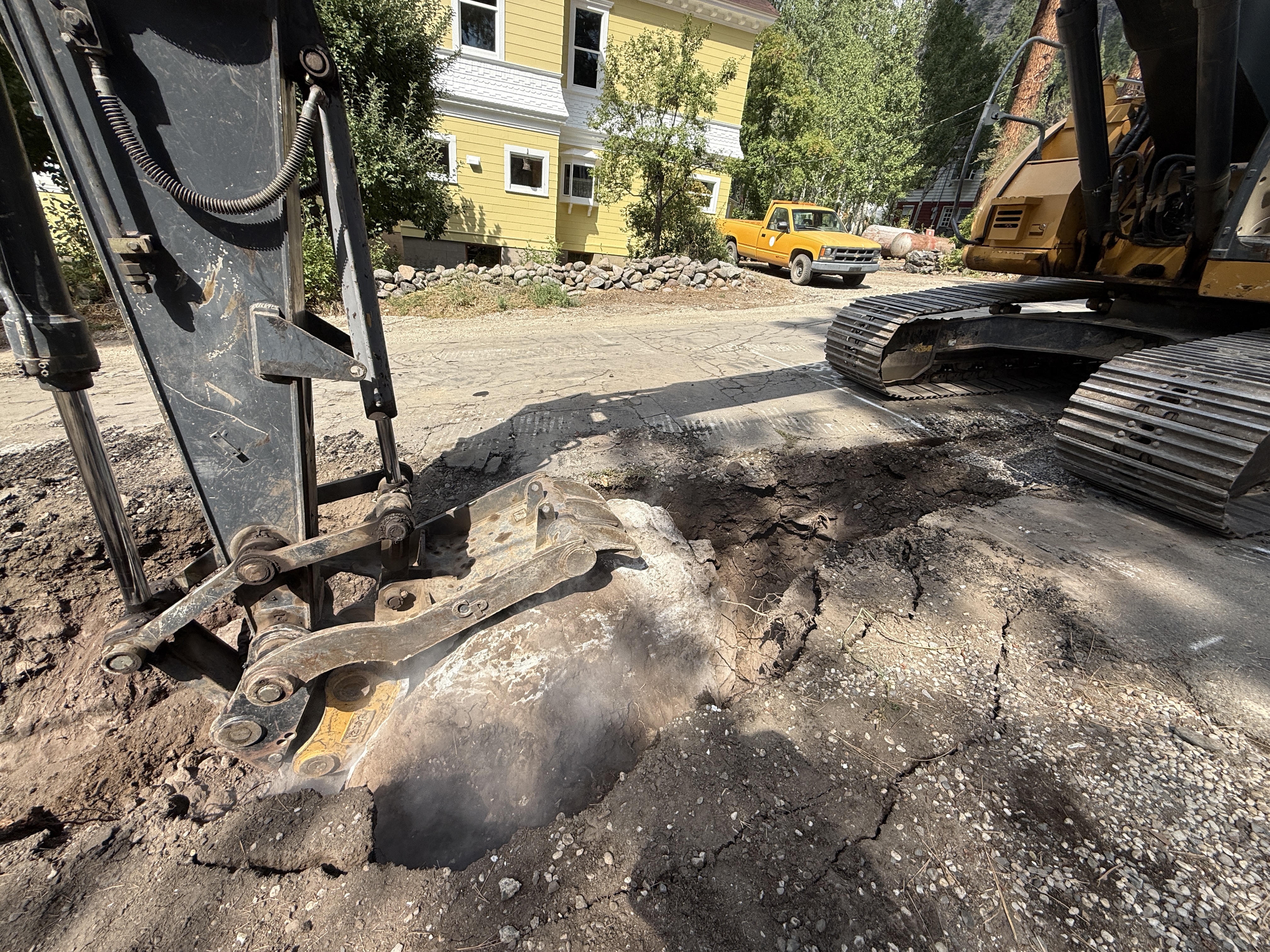 The image shows an excavator actively engaged in breaking concrete or hard ground. The bucket of the excavator is positioned on a cracked surface, with dust visible in the air, indicating active breaking. A yellow house and a yellow truck are in the background, providing context for a residential setting. The excavator is situated on a dirt path with visible metal tracks.