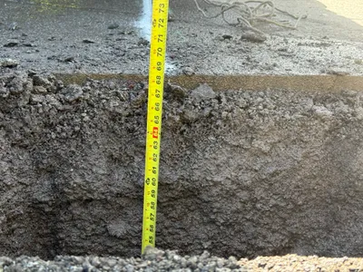 dirt road with open trench natural daylight equipment staged on road with traffic control
