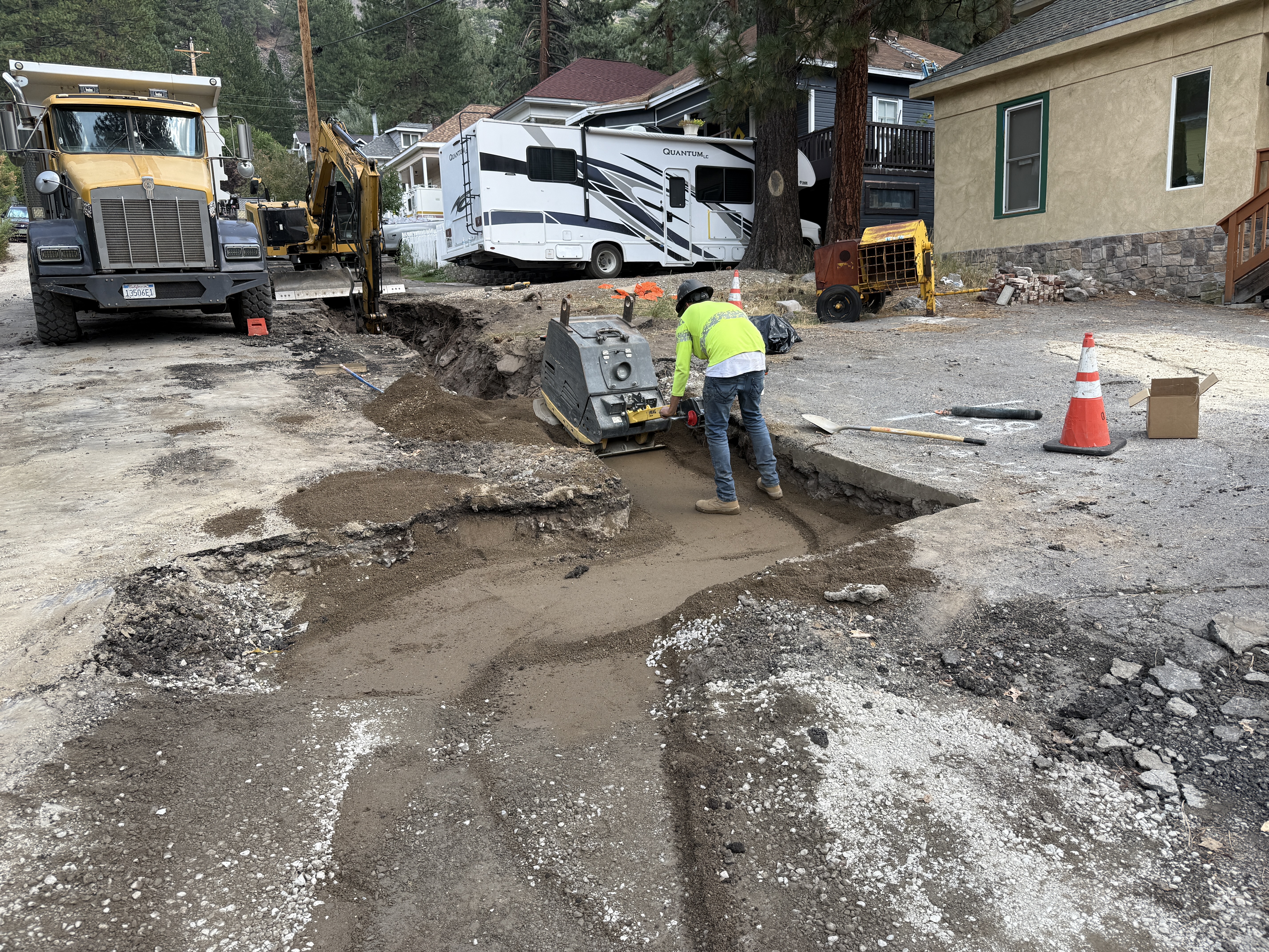 A worker wearing a hi-vis jacket operates a soil compactor in a trench located on the right side of a dirt road. A backhoe is positioned beside the trench, and a dump truck is parked on the left. The work area is marked with traffic cones. The trench appears to be part of site preparation or excavation activities.