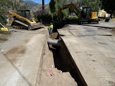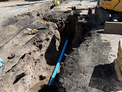 trenched soil with exposed pipe clear sunlight accessible work area marked by cones