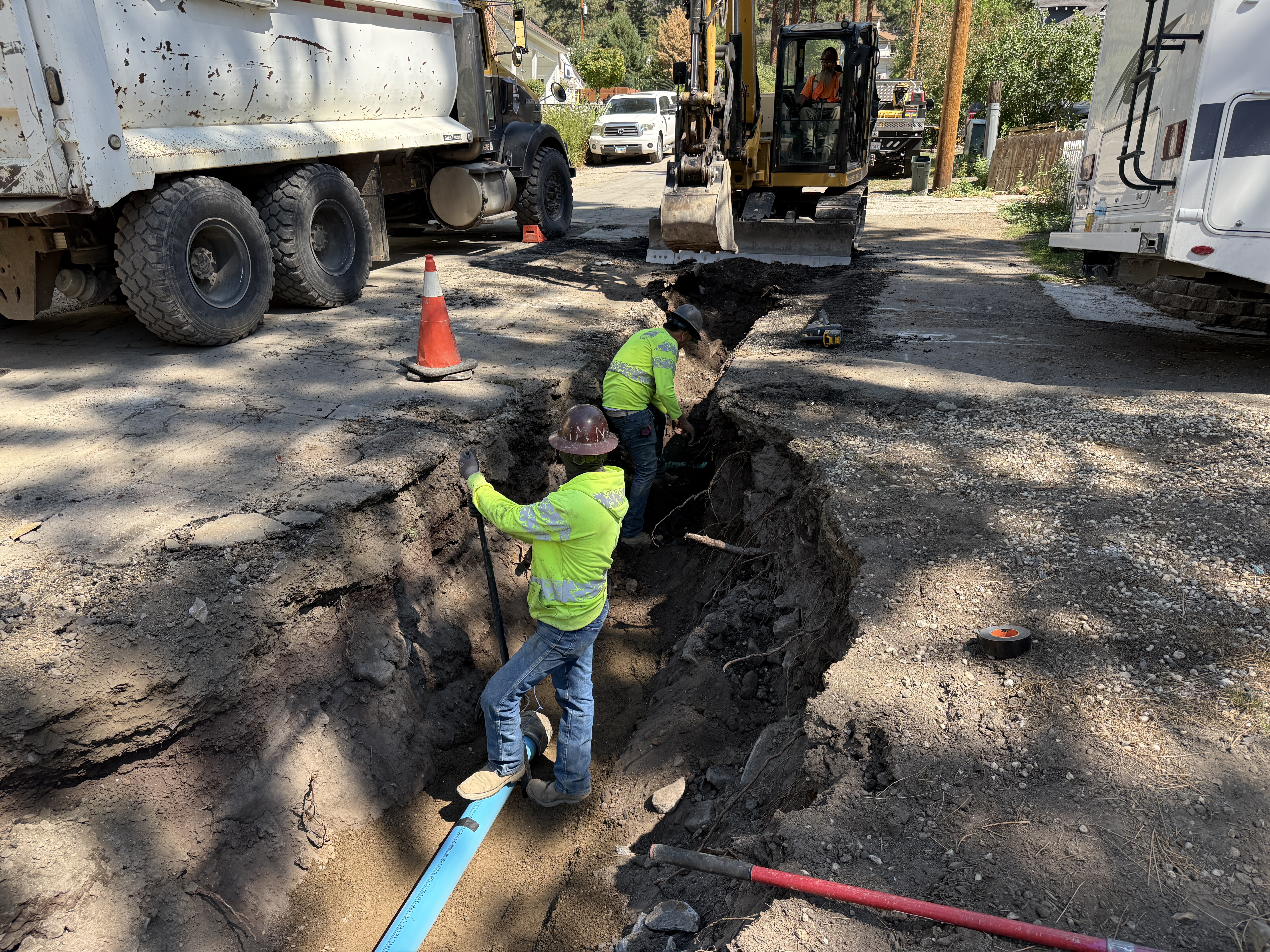 Safety gear like hard hats and hi-vis vests are visible, with cones marking the trench but no trench boxes are visible.
