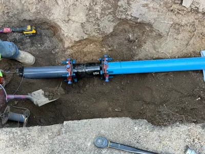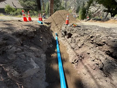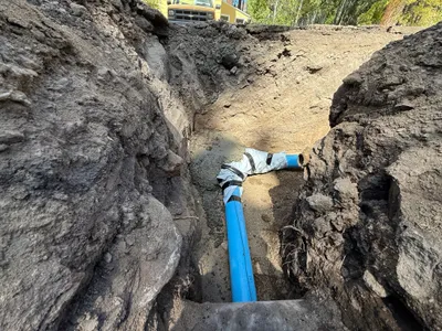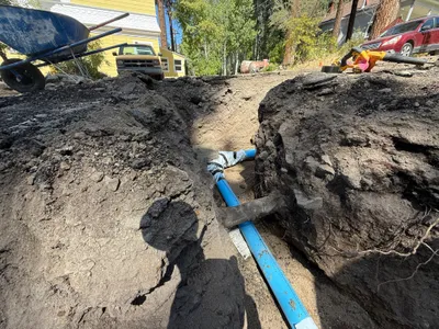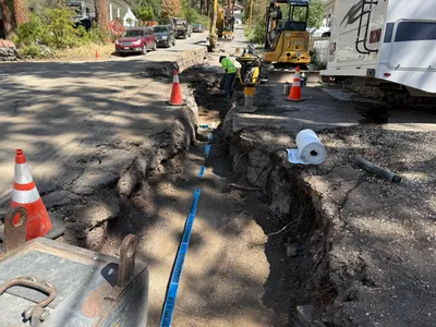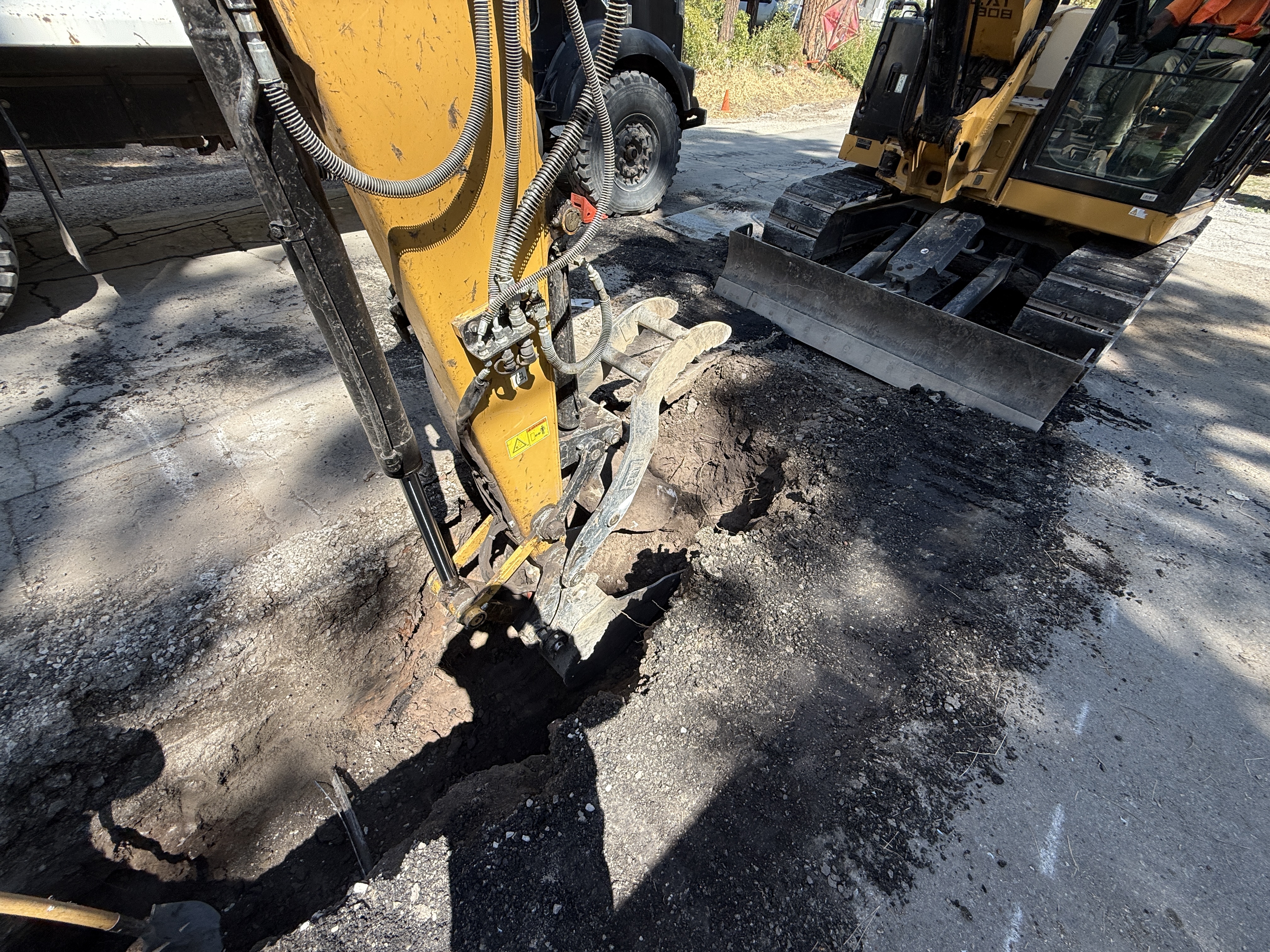 The image shows an excavator digging a trench in an asphalt surface. The excavator's arm is actively engaged in excavation next to a tracked vehicle. The trench appears to expose soil beneath the pavement. The scene suggests ongoing excavation work but the exact purpose is unclear.