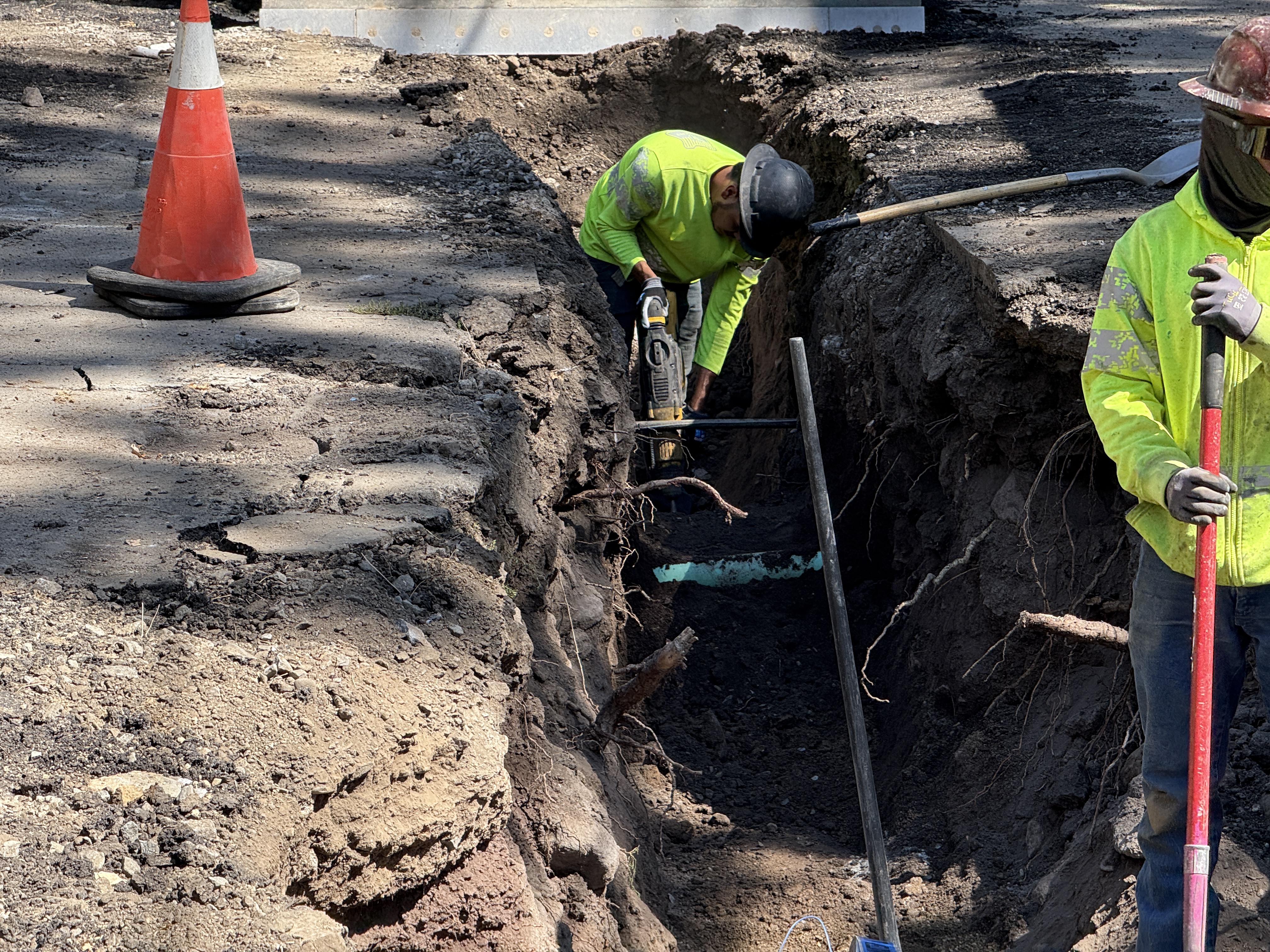 Safety features include hard hats, hi-vis vests, and a traffic cone marking the trench.