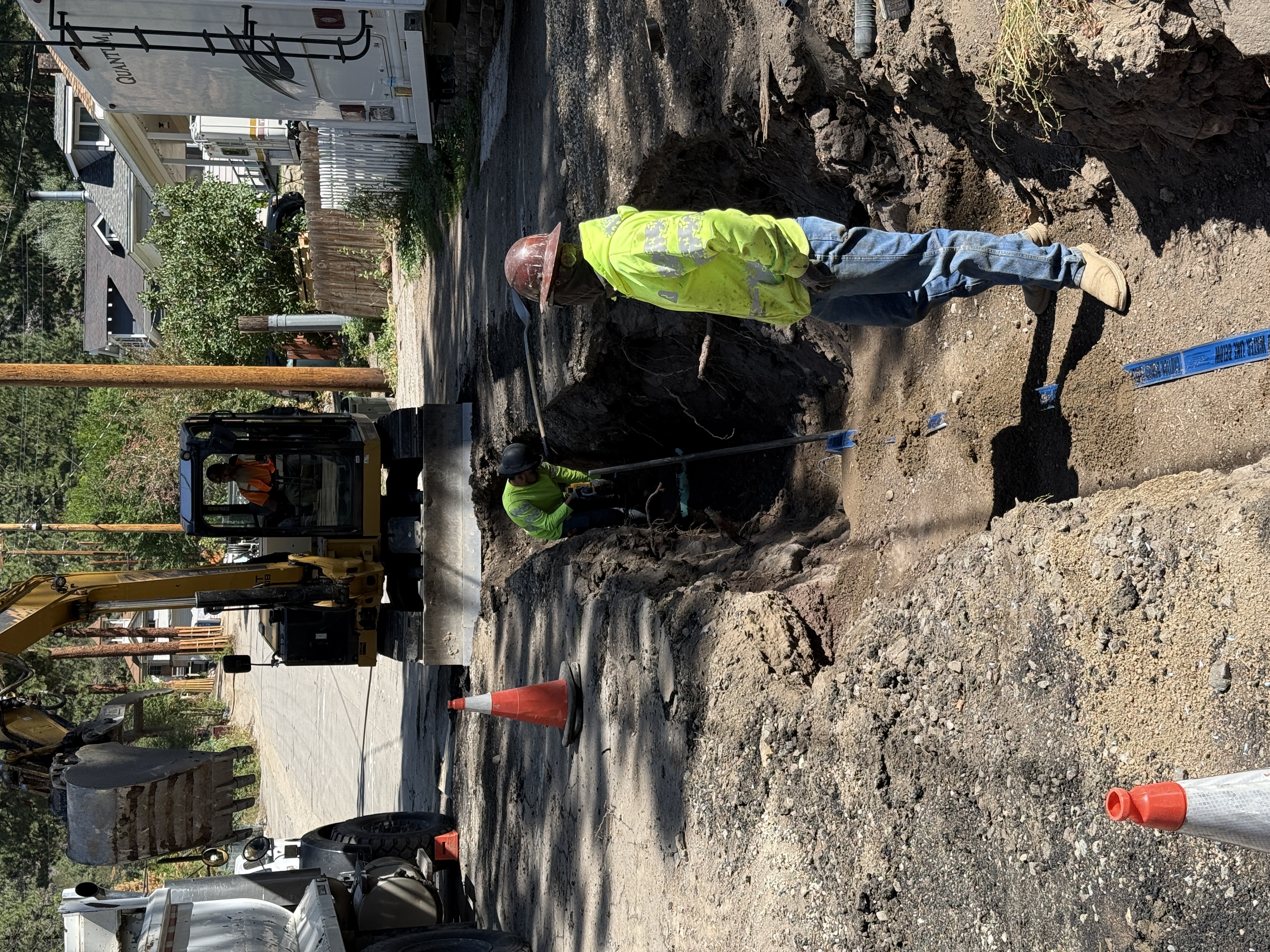 PPE is worn by workers, and safety cones are used; open trench poses a potential hazard.