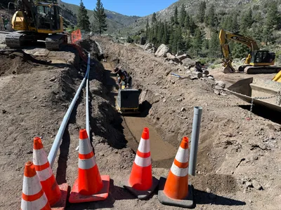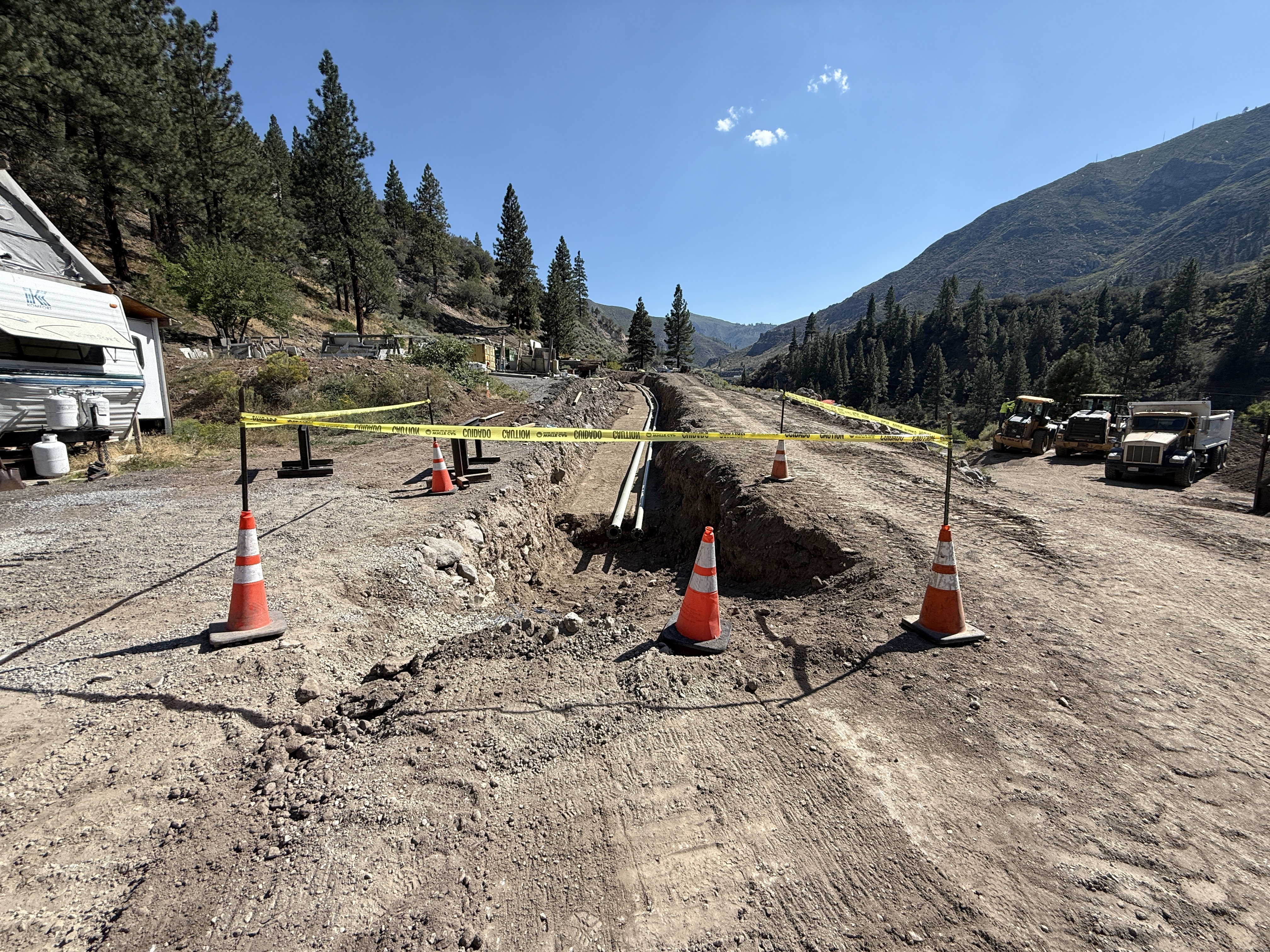 An open trench is marked off by traffic cones and yellow caution tape on a dirt road. Several pieces of heavy machinery like bulldozers and a dump truck are parked nearby. The site is situated within a wooded and hilly area, and the trench appears to be for pipeline work given the visible pipes in the trench. There is no active work being performed in the image.