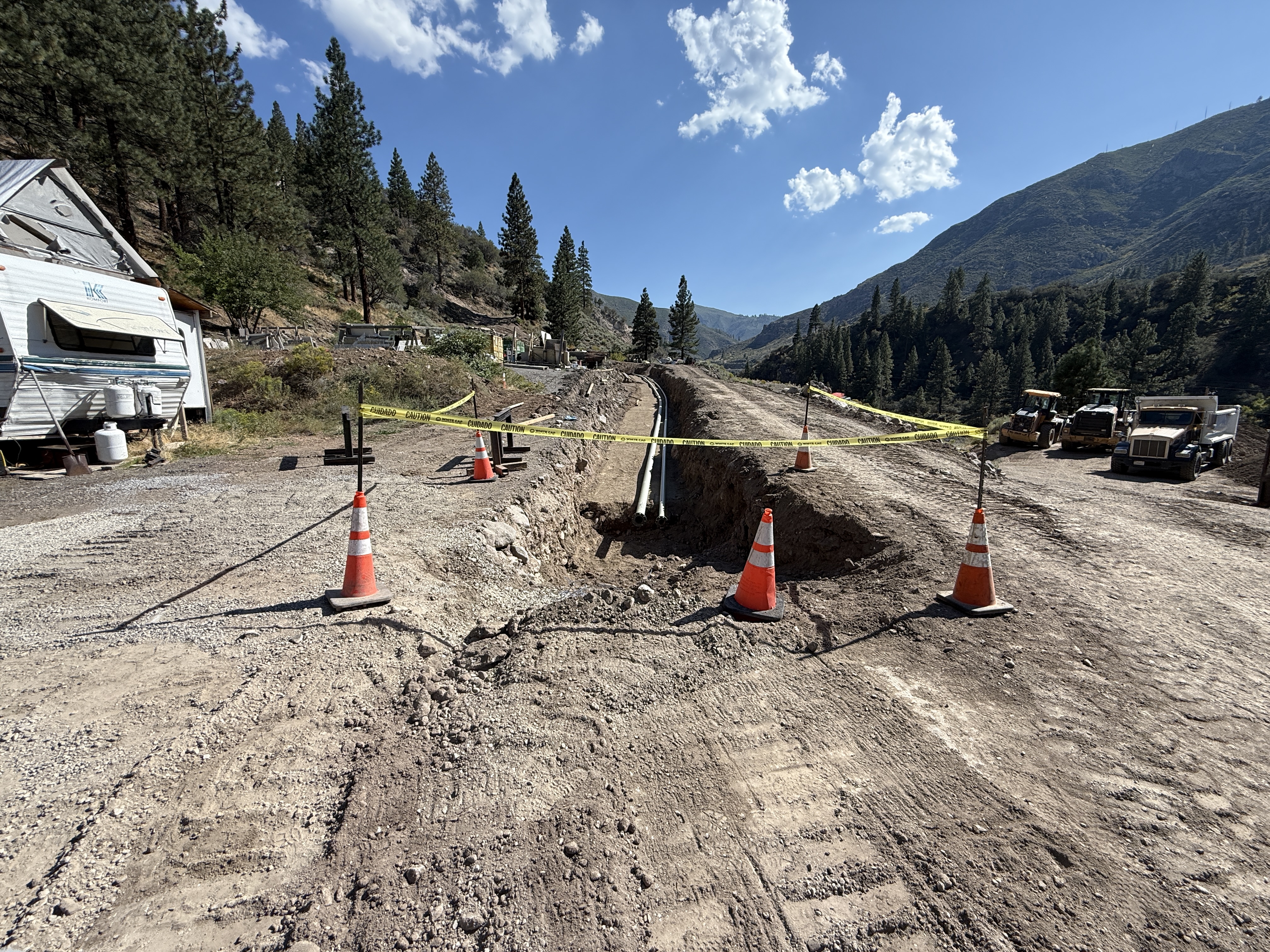 The image displays an open trench running parallel to a dirt road, marked by caution tape and orange construction cones. There are pipes visible within the trench. To the right, there are construction vehicles such as a bulldozer and a truck. The surrounding landscape is mountainous with a clear sky.